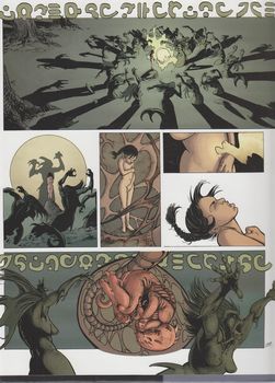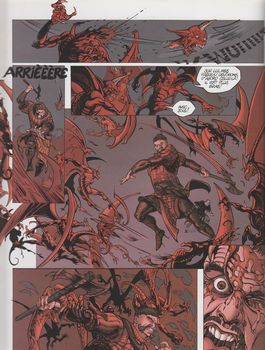 remarques: | n.b. les pages de garde changent les deux corps des époux Roquebrune, Payen et Gwenaldren, sont jetés sans sacrement par Perrin et Julien, fils d'Adémar, dans les marécages où ils sont récupérés par d'hideuses créatures: les vouivres n.b. la vouivre (ou wyverne) est une créature fantastique mythologique, elle prend la forme d'un dragon ou d'un serpent, selon les traditions régionales, en héraldique, elle est aussi appelée guivre entretemps, Cyliane négocie toujours avec les chimères, elle leur offre de retrouver le pouvoir du chant et de revoir la lumière du jour, mais le maître-chimère ne veut remettre leur secret (la dimension divine) qu'à Abeau, leur seul héritier car Cylinia est remplie de haine et ne peut procréer, donc de leur donner des héritiers ainsi les stryges (autre nom des chimères) continueront d'exister à travers Abeau et le maître-chimère demande maintenant à Cyliane de lui ramener Abeau de son côté, Adémar questionne Abeau maintenant en son pouvoir, Abeau lui révèle l'existence de sa soeur Cyliane, Adémar et Julien veulent alors utiliser Abeau pour attirer Cyliane et s'en débarrasser mais Sylvine la servante a tout entendu et part avertir Cyliane d'autre part dans les entrailles du château, Guéraud et Bertaire espionnent toujours les chimères, mais Bertaire a peur et ne veut pas les combattre comme lui suggère Guéraud qui traite Bertaire de lâche et veut le dénoncer, Bertaire poignarde alors Guéraud par derrière, mais il est à son tour ataqué par les kobolds >> p. 20/21 la lutte de Guéraud et Bertaire contre les kobolds, Guéraud meurt au combat et Bertaire reçoit le baiser de l'oubli par le maître-chimère dans les souterrains du château, Julien se débarrasse du félon Perrin en le jetant dans les basses-fosses par la suite, Sylvine a retrouvé Cyliane mais celle-ci accuse Sylvine de travailler pour son compte et l'offre comme sacrifice aux vouivres du marais en concluant avec elles un pacte pour recevoir l'apparence d'un dragon ailé afin de pouvoir délivrer Abeau >> p. 32/33 à nouveau les affreuses vouivres des marais >> p. 36 et Cyliane transformée en dragon ailé à Roquebrune, Julien tombe sur Bertaire qui erre dans les souterrains en proie à une folie mystérieuse, Adémar et Julien décident alors d'attaquer les monstres cachés dans les entrailles du château mais aupraravant ils doivent faire façe au dragon ailé qui cherche à libérer Abeau la tentative de Cyliane échoue, elle est blessée et avec Abeau, ils sont tous deux jetés dans les basses-fosses du château >> p. 38 à 45 le combat du dragon ailé contre les gardes du château >> un super album avec un scénario plein d'intrigues, très captivant avec un graphisme bien exécuté |