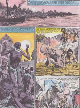 remarques: | dans la collection un homme, une aventure 4e trimestre 1979, péface de 2 pages par Gino d'Antonio, tome 12 de la collection information sur l'origine de la secte thug aux Indes = une confrérie d'assassins, adeptes de la déesse Kali, appelés les étrangleurs car ils devaient tuer leurs victimes sans verser une goutte de sang, ils ne procédaient à ce rituel religieux que durant une seule période de l'année et autrement ne se distinguaient pas des autres individus; les anglais, lors de la conquête des Indes, réussiront à éliminer la plupart des membres de la secte >> p. 5 la volonté d'un dieu qui joue avec l'existence de chaque être vivant à Bénarès, au XIXème siècle, un paria indien assiste au meurtre d'un blanc par un blanc et le paria propose à Raven le meurtrier de devenir son complice pour de l'argent >> p. 18 la crémation d'un riche indien accompagné de son épouse, Sâti, elle bien vivante tout criminel qu'il soit, Raven, l'homme du Bengale, sauve Sâti de son destin et s'enfuit avec elle; ils rejoignent une caravane de marchands en route pour Calcutta, mais déjà les membres de la secte thug ont jeté leur dévolu sur les marchands, Sâti est capturée et va être sacrifiée à la déesse Kali >> p. 38 l'attaque des thugs Raven contre l'avis de Suki le paria décide à nouveau de sauver la vie de Sâti amenée dans le temple de Kali >> p. 48 le temple de Kali Raven avec son arme à feu met en fuite les thugs, mais il ne pourra échapper à la colère de Kali-la-Noire qui garde Sâti et se débarrasse de Raven-le-Blanc qui a osé outrager la demeure de la déesse Kali >> un récit d'aventures mystiques avec l'homme du Bengale confronté à des forces divines auxquelles il ne croyait pas; tranche de vie indienne, bien conçue par Buzzelli avec un excellent graphisme fort en couleur n.b. cet épisode se démarque quelque peu des autres oeuvres de Buzzelli plutôt portées sur la caricature, l'album fait partie de la collection Dargaud, un homme, une aventure et est le dernier de la série |