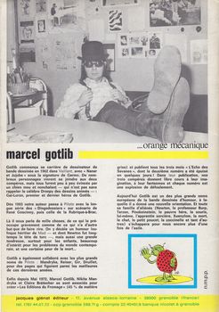 remarques: | 1) entretiens avec Gotlib par Jacques Glénat et Numa Sadoul commence à Edi-Monde, puis chez Vaillant avec Nanar et Jujube (1962) et Gai-Luron, débute chez Pilote en 1965 avec Goscinny pour les Dingodossiers et la Rubrique-à-Brac devient célèbre avec les rubriques sur Isaac Newton, le prof. Burp et la coccinelle omni-présente (style running-gag) en 1972 création de l'Echo des Savanes avec Mandryka et Brétécher, Gotlib aura aussi été influencé par Mad (Kurtzman), n'aime pas les histoires à suivre, mais est passionné par le cinéma (Cinemastock) 2) la R.A.B. (Rubrique-à-Brac) by Numa Sadoul - principe de la description de l'enfance et de la caricature mordante en partant de détails tels que la gravitation universelle avec également une certaine auto-parodie, le tout s'appuyant sur l'absurde, Gotlib utilise beaucoup les calembours en y mêlant un style quelque peu Walt Disney, sa technique favorite reste toutefois le hiatus (graphique/planche à plusieurs niveaux) n.b. hiatus = manque de continuité, de cohérence, décalage les thèmes du rire: - sujets graves et sérieux - les raseurs (exemple Giscard d'Estaing) - les grands sujets de l'humanité (Isaac Newton) - les études animalières (prof. Burp) - les fables-express (Pinokenstein) en langage étudié - les enfants et le monde (l'innocence) - les grands pastiches et caricatures - divers sujets tels que la télévision, le cinéma, la science-fiction et même la bande dessinée (le tarzan de Hogarth) 3) la saga de Gai-Luron by Yves Di Manno - premier et dernier héros de Gotlib, les ancêtres de Gai-Luron ayant été Blaise et Basile ainsi que le père Laglume - le monstre Gai-Luron dans le Gotlibland - série d'humour à nouveau sous la forme de gags démystifiants, - le héros dans le genre d'Achille Talon, - rôle de l'amoureux transi - la logique dans l'absurde, exemple: en parlant du petit chaperon rouge, soit elle a perdu la raison, soit elle est devenue folle n.b. on dit que Gotlib trempe sa plume dans une encre corrosive 4) classiques d'une autre dimension by Gianni Brunoro - essai sur l'aspect "classique" de l'humour chez Gotlib - les récits narratifs de Gotlib dont les sujets sont puisés dans la réalité qui nous entoure avec un goût de la répartie absurde et surréelle 5) - le calembour dessiné by A.P. - translation du graphisme en un message ou jeux de mots - exemple: un corps beau pour un corbeau - le graphisme de Gotlib pullule en ce sens, notamment aussi de symboles, d'allusions et de sarcasmes 6) - le surréel et l'absurde dans la R.A.B. by Yves di Manno - sous l'inflluence de Mad ainsi que de Krazy Kat - Gotlib (RAB), Mandryka (concombre masqué), Fred (Philémon) - l'escalade de l'absurde (l'absurde dans l'absurde), le tome II de R.A.B. en étant le meilleur exemple avec le prof. Burp, le petit poucet, Mathou Matheux et "nos amis les bêtes" mais Gotlib a su aussi créer un univers entièrement nouveau avec des gags délirants 7) - petit bestiaire intime by J.-M. Lannes - les animaux sont caricaturés en les utilisant pour critiquer les humains sur le genre de La Fontaine, seul l'enfant pur n'est pas caricaturé >> à noter en page 26 les illustrations sur la girafe Gotlib caricature également notre siècle par l'entremise du savant Isaac Newton = l'éternel raseur 8) - le grave et la folie chez Gotlib by Numa Sadoul - le grave = nostalgie de l'enfance, quête de genre de vie et analyse de l'espèce humaine - la folie = démence imaginative du créateur - sujet de la mort, lutte pour la vie, mystère de la création et évolution de la civilisation = thèmes soulevés régulièrement par Gotlib 9) bibliographie dans Pilote (1965-1972): les Dingodossiers, rubrique à brac (R.A.B), les clopinettes dans Vaillant: Nanar et Jujube dans Pif: Gai-Luron autres personnages: Titou, Bob et Hoppy, Emery, Pouch >> un cahier qui décrit la philosophie caricaturale personnelle de Gotlib en mystifiant et démystifiant à la fois et qui crucifie l'absurdité humaine on y développe quelques bon thèmes, mais il faut être un peu philosophe pour lire ce cahier |