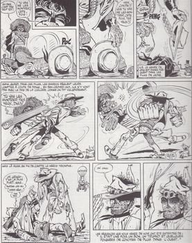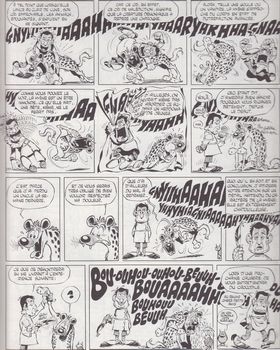 remarques: | album cartonné grand format, en quadrichromie = 50% couleur, 50% N&B réédition du 2ème trimestre 1973 de l'édition originale de janvier 1971 avec la même couverture d'album l'âge d'or de la rubrique à brac, les gags sont au sommet de leur présentation, début de l'album par une parodie de Gotlib dans sa jeunesse les bandes animalières: - la hyène **, la poule **, le kangourou, - l'hippopotame, la girafe ***, le cochon, - le cerf, le rhinocéros thèmes de science-fiction: - l'homme du futur, le héros spatial, - les univers parallèles, - le voyage dans le temps et le paradoxe temporel - robot et mutant et enfin Xuenylom l'extra-terrestre ** autres thèmes: - l'enfance (bébé), Napoléon enfant, - introduction d'Isaac Newton **, - le monde inconnu de Prince Vaillant, - Superman, les rêveurs - la rubrica bracofsky **, - la prestidigitation, - le langage cinématographique, - les spaghetti-western **, - Tarzan et Grolarzan, - la statue qui rend fou, - le temps des fées, le petit poucet **, - Matou Mathieux (avec Fred), - Pinokenstein ** ** = les meilleurs gags >> probablement le meilleur album de la série avec des gags exceptionnels qui ne pourront plus être surpassés, le graphisme est toujours très bon avec la coccinelle qui est maintenant omni-présente n.b. mais le personnage sur la couverture n'est pas mentionné dans les récits de l'album (les tables de la loi du gag?) annexes - couverture et extraits de l'album - réédition de 1999 |