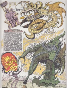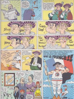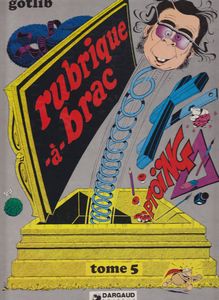 remarques: | cinquième et dernier album des rubriques à brac, toujours de 80 pages cartonné, grand format, quadrichchromie 50% couleur 50% NTB édition originale d'avril 1974 avec en pages de garde l'équipe rédactionnel de Pilote soit Goscinny, Charlier, Alexis, Bussemey, Cabu, Chakir, Delynx Fred, Gébé, Gotlib, Godard, Loro, Lob, Mézières, Poppé, Reiser et Ricord+Mulatier des concerts Mayol(?) avec les épisodes: - Lucky Luke spaghetti, Superdupont, - Isaac Newton, - Lone Slonono ** (2 (épisodes: l'allée aux cent collines et Terra me voilà), - la pantomime, le camouflage, - les espions 007, - la brigade mondaine avec Bougret et Charolles, - le coût de la vie **, - l'avoir fiscal avec Valéry Giscard d'Estaing, - merchandising **, le piano ** - tranche de vie ** (en 180 vignettes), - farces du 1er avril, pédagogie, chansons les bandes animalières: - le crocodile, l'escargot, le chat, contes de fée: - la belle au bois dormant, fable express ** = les meilleurs gags >> toujours de bons gags dont les bandes animalières, mais petit à petit les rubriques se dégradent, restent toutefois toujours encore très valables avec un bon graphisme, la suite paraissant dans trucs en vrac n.b. 4 récits-gags faits en collaboration avec Bretécher, Gir, Druillet et Mandryka annexes - couverture et extraits de l'album - la réédition de 1999 ne change pas la couverture |