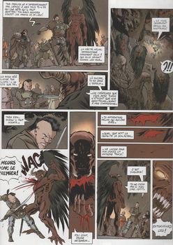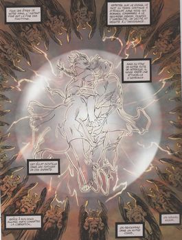 remarques: | dernier album de la série le clan des chimères est avisé par un kobold des manigances du clan des "réprouvés" dirigés par le cornu qui s'apprête à combattre la troupe d'Adémar entretemps Cyliane qui a avoué à son frère Abeau que sa haine l'avait entraîné à mentir lui déclare qu'elle ne le trompera plus; Cyliane et Abeau quittent Perrin pour tomber sur Bataire de Fondfroide qui erre à demi-fou dans les souterrains du château, maudit par le baiser de l'oubli >> p. 12/13 la lutte inégale entre les troupes d'Adémar et les chimères Cyliane intervient alors, elle demande que, puisque Adémar et Julien sont morts au combat, le reste de leurs hommes soient épargnés, Cyliane veut aussi maintenant qu'elle et Abeau deviennent les héritiers des chimères ou aucun ne le sera, c'est un coup risqué mais le cornu accepte la proposition de Cyliane et accorde la vie aux survivant des gens d'Adémar après leur avoir donné le baiser de l'oubli >> p. 21 apparition fantômesque de Smérald, mère de Cyliane qui lui reproche le pacte qu'elle a fait avec le chef des réprouvés >> p. 23-25 la cérémonie d'inspiration avec Cyliane et Abeau qui est interrompue par le maître du clan des chimères, celui-ci remet à l'ordre le cornu et enlève Cyliane et Abeau de son emprise >> p. 32 la réaction brutale du cornu sur ses congénères (quelque référence à Dieu le chef et Satan le réprouvé) sept ans plus tard, Cyliane et Abeau se retrouvent dans un couvent où ils avaient été déposés par des "anges noirs", ils n'ont pas tout oublié, possèdent encore plusieurs dons reçus par les chimères dont celui de la longévité et décident de retourner sur les ruines de Roquebrune où ils rencontrent un rescapé du combat avec les chimères qui leur raconte l'histoire de Roquebrune depuis le début, c'est à dire à partir de la confrontation entre Payen et Adémar de son côté, l'ancien inquisiteur Bertaire accompagné de Perrin se lance dans la recherche et l'étude des chimères et Bertaire finira sa vie en rassemblant des témoignages qui étudient les chimères et rassemblent les connaissances impies pour percer les mystères et les secrets des chimères, ces connaissances seront compilées par le moine Pierre Venonce et éditées dans une "bible noire" qui sera appelée "le grimoire de Venoncius" >> un album récapitulatif et explicatif qui met fin au cycle du clan des chimères un récit présenté dans un style abstrait, un peu compliqué et surtout mystique avec un graphisme un peu moins recherché ce cycle du "clan des chimères" malgré une parution postérieure reste essentiel pour une meilleure compréhension du cycle "le chant des stryges" qui en sera quelque peu la continuation |