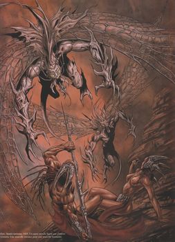 remarques: | album documentaire sur les stryges, basé sur le livre de Peter Mackenzie "contact and inducement" les stryges = des femmes au corps d'oiseau = créatures monstrueuses dotées de pouvoirs surnaturels et nées de nos cauchemars ou de notre psychisme stryge dérive du grec "lier, attacher", c'est à la mythologie grecque que l'on doit les stryges = des femmes au corps d'oiseau capable de prendre l'apparence humaine pour séduire les mortels, se rapportent aussi aux Moires ou aux Parques ou filles de la nuit qui président à la destinée inéluctable de chaque individu autres divinités grecques ailées: Hypnos dieu du sommeil et Thanatos incarnation de la mort et fournisseur d'Hadès le chant des stryges = message des dieux de l'Olympe grec = reflet de la parole divine caractérisée par Isis, messagère des dieux chez les Assyriens, Lilith et ses filles, les Lilim, représentaient l'esprit maléfique mais c'est vers le diable que les stryges se rapportent le plus car ils ont le pouvoir de s'emparer de l'esprit des humains >> p. 20 un stryge et sa victime dans les versions primitives de l'Ancien Testament, Yahve était le dieu du bien et du mal, plus tard Satan (= adversaire en hébreu) devint, après sa rebellion, le dieu du mal représentation aussi du bien et du mal dans la mythologie aztèque par Quetzalcoatl (le dieu serpent-oiseau) et Tezcatlipoca (le dieu à la tête d'ours) la mythologie égyptienne est aussi très riche en la matière: Horus à la tête de faucon, Seth = dieu du mal, Thot = dieu de la connaissance, Iris la magicienne, Mout = mère des êtres >> p. 27 les monstres et autres êtres fabuleux les stryges = créatures associées à la séduction et à la mort, mais il est bien connu que la quête de ce qui est caché reste la préoccupation essentielle de l'homme et la mort seule est au bout de l'expérience >> petit exposé qui donne une vue d'ensemble sur les stryges (ou chimères), c'est un mythe mais dans chaque mythe, il y a une part de réalité, album assez intéressant mais surtout doté de superbes illustrations chimère = hybride = croisement de deux individus de deux variétés ou sous-espèces, certains hybrides peuvent se reproduire, d'autres sont stériles, exemples: le bardot = croisement entre ânesse et cheval ou le mulet = âne et jument; le tigron = croisement entre un tigre et une lionne et le ligron = croisement entre un lion et une tigresse ouranien: 1) de Ouranos, divinité primordiale personnifiant le ciel 2) relatif aux divinités célestes grégaire: se dit d'une espèce animale qui vit en groupe ou en communauté mais sans structure sociale annexes - 1er, 4ème plat et ex libris - deux illustrations sur les stryges pour plus d'information sur les stryges et l'univers des stryges >> voir www.stryges.com |