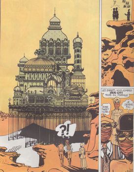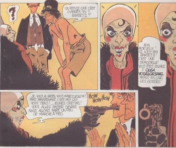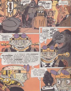 remarques: | Lucien Brindavoine, personnage qui jouera un rôle-clé dans les prochaines aventures d'Adèle Blanc-Sec, entraîné dans une aventure qui le dépasse complètement, rencontrant des individus plus loufoques les uns que les autres, Brindavoine nous apparaît avec tous ses défauts et ses faiblesses: lâche, profiteur, mais tellement humain Lucien Brindavoine convoqué par Basile Zarkhov pour une mission spéciale se retrouve à Istamboul chez un certain Topoyouglou où il rencontre l'anglais Oswald Carpleasure ensemble ils entreprennent un voyage vers un but inconnu, harcelés continuellement par Olga Vogelgesang, alias Ramsès II, alias la mort violente finalement ils arrivent à Ironcity, une cité métallique sur pilotis où règnent Otto Lindenberg, un handicapé milliardaire avec son gorille Albert, son conseiller Klotz et son pilote Jean-Etienne de la Roseraie, mais agressé par Olga Vogelgesang, Lindenberg s'enfuit dans un dirigeable et durant le vol, Lindenberg sera trahi par Klotz et de la Roseraie, tout le monde périra sauf Brindavoine qui tombera en Mer Noire et sera recueilli par le navire impérial "Nicolas II" de la marine du tsar où Brindavoine apprend que la première guerre mondiale vient d'éclater >> p. 10 Carpleasure qui confond Brindavoine avec Pleindavoine >> p. 15 pas de censure pour les buveurs de whisky (on n'est plus à l'époque du capitaine Haddock) >> p. 33 les bonnes blagues de Lindenberg >> un récit complètement incohérent (même Tardi l'admet) mais amusant et surtout un superbe graphisme dans cet album original (on retrouvera Brindavoine dans les aventures d'Adèle Blanc-Sec) |