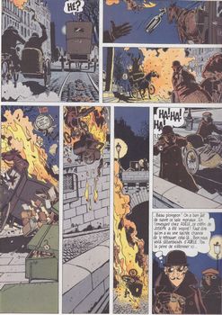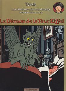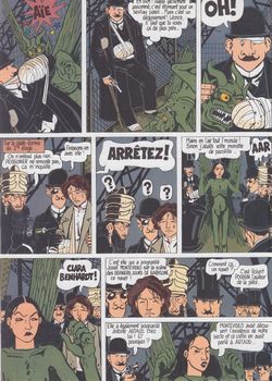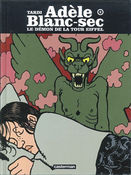 remarques: | le démon de la Tour Eiffel ou la secte de Pazuzu Adèle Blanc-Sec et Simon Flageolet toujours à la recherche du butin de la bijouterie Mignonneau dont l'objet mystérieux est maintenant identifié: c'est une statuette représentant le démon assyrien Pazuzu visite d'Adèle et de Flageolet chez Poissonier, l'artiste-décorateur mêlé au culte de Pazuzu et qui cache Albert, eux aussi recherchent la statuette de Pazuzu alors que l'inspecteur Caponi enquête sur un meurtre commis durant une scéne théâtrale comportant le culte de Pazuzu >> p. 10/11 la représentation théâtrale de Pazuzu >> p. 14 Adèle Blanc-Sec enfin au sec entretemps, mort d'Edith Rabatjoie en essayant le ptérodactyle 2, mort aussi de Joseph abattu par Albert, cas de peste à Paris, attentat sur Adèle au Pont-Neuf, Adèle découvre un passage secret au Pont-Neuf menant à la secte de Pazuzu qui projette de semer la peste à Paris, ville que la secte trouve rivale de Babylone, Adèle découvre que le commissaire principal Dugommier est le grand frère de la secte, enlèvement d'Adèle par Albert qui veut l'offrir en sacrifice à Pazuzu, Flageolet est agressé et disparait >> p. 23 dans le repaire de la secte des adorateurs de Pazuzu l'inspecteur Caponi réussit à débusquer les criminels: Poissonier, Dugommier et l'actrice Clara Benhardt qui elle est déguisée en dieu Pazuzu, lors de l'intervention de police, Albert et Poissonier seront éliminés mais Clara parviendra à s'enfuir et Dugommier reprendra la situation en main en mutant Caponi comme simple gendarme à la circulation >> p. 46 la méthode Boutardieu est mise au point par Ménard et Espérandieu, mais une présence étrange et menaçante colle toujours aux pas d'Adèle, la suite dans l'album "le savant fou" >> à nouveau un très bon album, le scénario est captivant quoique parfois déroutant avec un très bon graphisme et une jolie couverture d'album annexes - couverture et extraits - couverture de la réédition |