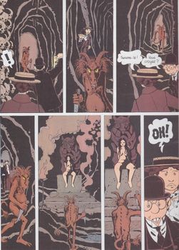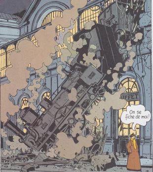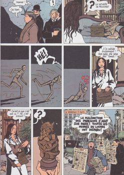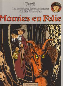 remarques: | momies en folies ou la résurrection de la momie d'Adèle rencontre d'Adèle avec Félicien Mouginot, spécialiste de la survie après la mort alors que les momies disparaissent des musées parisiens >> p. 4/5 des cadavres affublés d'une tête de bouc apparaissent dans Paris >> p. 12 la mystérieuse statuette laissée par Mouginot chez Adèle nouvel attentat sur Adèle Blanc-Sec qui va enquêter avec Mouginot dans le laboratoire de feu Espérandieu >> p. 13, 15 et 19 les attentats spectaculaires sur Adèle dont >> p. 19 le naufrage du Titanic le 14.12.1912 Adèle est enlevée en hypnose par la secte de Pazuzu et par celle des adorateurs du diable, mais son exécution est retardée suite à l'apparition de la secte du démon des glaçes soit Carlo Gelati, Chapoutier, Simone Pouffiot et Jérôme Plumier qui s'entretuent les uns les autres y compris Dugommier commissaire principal et d'un grand frère de la secte des adorateurs du diable resté anonyme (ce serait une haut fonctionnaire de la 3ème République) alors que Clara Benhardt ressuscitée sous les traits de Pazuzu poignarde à mort Adèle Blanc-Sec >> p. 25/26 le sacrifice d'une femme par l'homme déguisé en bouc >> p. 41 mort d'Adèle poignardée par Clara le cadavre d'Adèle est récupéré par Mouginot (seul rescapé de la tuerie) qui veut essayer de réanimer Adèle, Mouginot échappe de peu à un nouvel attentat projeté par Clara Benhardt grâce à l'intervention de la momie d'Adèle qui élimine Clara Benhardt définitivement et qui conseille Mouginot pour réanimer Adèle mais Mouginot est un peu plus tard abattu par le tueur Thomas Rove engagé par Dieuleveult, Rove sera à son tour éliminé par Dieuleveult qui reste pratiquement le seul rescapé de l'histoire et qui part à la recherche du corps d'Adèle pour se venger début de la première guerre mondiale >> p. 42 les explications de Tardi sur la fusion de la secte de Pazuzu et celle des adorateurs du diable (les boucs) ainsi qu'une petite explication sur l a disparition générale des momies égyptiennes dans le monde >> un album au récit cette fois déjà bien désordonné et qui commence à donner aussi des signes de folie tout en restant plutôt intéressant et dans lequel presque tous les principaux personnages trouvent la mort y compris Adèle Blanc-Sec à qui Tardi réserve toutefois une seconde vie dans le prochain album qui reprend la série de adieu Brindavoine qui réapparaîtra dans la série Adèle Blanc-Sec dans le 5ème épisode de la série "le secret de la salamandre" pour le reste le graphisme est à nouveau très bon avec probablement la meilleure couverture d'album de la série annexes - couverture et extraits - couverture de la réédition |