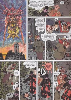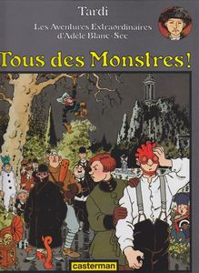 remarques: | 9 ans après le tome 6, les aventures d'Adèle restent dans le style de l'album précédent, toutefois on ajoute cette fois la monstrueuse collaboration pour le récit des dessinateurs cités ci-après d ans l'ordre de leur apparition, la plupart sous forme de monstres >> p. 38 le monstre Gotlib enfin réapparition de la pieuvre aux tentacules rouges et de l'éditeur Bonnot, Dieuleveult toujours à la recherche d'Adèle pour la tuer par haine immense, Dieuleveult avec son aide imbécile Caduc réussira à capturer Adèle mais occupé par d'autres affaires (Chalazion, un ancien complice qui veut la peau de Dieuleveult), Dieuleveult laisse tomber Adèle qui est délivrée par un certain Honoré Fia épisode complémentaire: Honoré Fia, un artiste, aux tranchées de 14-18, est marqué par une peur cauchemardesque, blessé à la tête, il est soigné par le dr Pochard (alias Dieuleveult) par trépanation et suite à cette intervention Honoré Fia développe la faculté de matérialiser un monstre avec des tentacules rouges, suite aussi à ce maléfice monstrueux il devra rompre avec sa fiançée Georgette Chevillard, fille du richissime boucher Chevillard, fournisseur attitré de viande fraîche pour l'armée française durant la guerre apparition d'un nouveau venu pour clotûrer la fin du récit: le druide Tudek Babylonosor qui avec son bandoneon-rédempteur-électrique essaiera d'éliminer les monstres restent pour les prochaines aventures: Brindavoine et Adèle Blanc-Sec qui ressemble de plus en plus à Bécassine ainsi que Dieuleveult qui s'acharne sur son ancien complice Chalazion >> un album qui débloque complètement avec un graphisme qui baisse quelque peu en qualité et si on a bien du mal à s'y retrouver dans ce carnaval de monstres, le texte avec de nombreuses citations tout azimut reste amusant à la lecture annexes - couverture avec extrait - couverture de la réédition Information - les nombreux monstres de l'album ne sont pas tous dus à Jacques Tardi qui a invité sur cet album les dessinateurs Pétillon, Mézières, Florence Cestac, Boucq, Solé, Gotlib, Rochette, F'murr, Vuillemin, Kelek, Garrigue, Comès, Bilal, Choupôt, Fred, Nicollet et Philippe Druillet sans oublier deux de ses propres enfants Oscar et Rachel. - le titre de l'album n'est pas une référence au défilé de monstres imaginaires, mais à une réflexion désabusée du vieil anarchiste au petit singe à la fin de l'album précédent, à propos des dirigeants du monde: "ils nous déguisent, un jour en poilu, un jour en clown, un jour en cadavre... tous des monstres" |