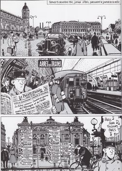remarques: | le gros pavé polar adapté librement d'un roman de Léon Malet, volume avec jaquette, N&B de 190 pages les aventures du détective privé, Nestor Burma, qui dirige l'agence Fiat Lux (que la lumière soit) n.b. à la fin du récit, Hélène, la secrétaire de Burma, qui semble avoir bien compris le déroulement de l'affaire Jo Tour Eiffel demande à Burma ce que signifie Fiat Lux énigme policière durant la seconde guerre mondiale (1941) commençant dans un stalag allemand où est emprisonné Nestor Burma qui fait la connaissance d'un curieux amnésique surnommé "la Globule", de fil en aiguille et avec beaucoup de détours, Nestor Burma remontera la piste de l'amnésique pour découvrir une bande de malfrats mêlés à l'affaire dont le principal: - le gros avocat Montbrison trahit en autre par son habitude de fumer des cigarettes Philip Morris au tabac blond qu'il allume un peu tout partout avec des allumettes plates les antagonistes: - le personnage principal: l'amnésique la Globule, alias Jo Tour Eiffel, alias George Parry, fameux cambrioleur repenti, soi-disant mort mais devenu amnésique - l'actrice (en toile de fond) Madeleine Morlain et son sosie Hélène Parmentier alias Hélène Parry, fille de Jo Tour Eiffel qui hérite d'un gros pactole dissimulé dans une maison sise 120, rue de la Gare à Châtillon dont Montbrison et ses complices veulent s'accaparer - Bob Colomer, détective ingénu, collaborateur de Nestor Burma, assassiné dans la gare de Lyon-Perrache - le commissaire Bernier à Lyon), complice de Montbrison qui fera tout pour mettre Burma sur une fausse piste - le commissaire Faroux à Paris qui collabore avec Burma - Max Covet, journaliste au Crépuscule, ami de Burma (présenté probablement sous les traits de Tardi) - Hélène Châtelain, secrétaire de Nestor Burma - Gérard Lafalaise, détective privé qui aidera Burma - Louise Brel, secrétaire de Lafalaise - le malfrat Paul Carhaix alias Paul Jalome, employé de Lafalaise et complice de Montbrison - Bébert, cambrioleur, compagnon de Burma dans le stalag qui aidera Burma à retrouver l'identité de l'amnésique, surtout en indiquant l'endroit où Jo Tour Eiffel a été torturé - Hubert Dorcières, chirurgien esthétique, qui changera le visage de Jo Tour Eiffel et l'éliminera par vengeance lors du séjour de l'amnésique dans le stalag où Dorcières a les fonctions de médecin de camp >> p. 9 le prisonnier amnésique >> p. 26 le pigiste Covet ressemblant à Tardi (pigiste = journaliste payé à l'article) >> p. 64 clin d'oeil à Jack Palmer >> p. 86 le Beretta 32 >> p. 126 l'affiche où Tardi est condamné à être fusillé par les allemands >> p. 135 le lieu où tout devient clair pour Burma (LaFerté-Combettes) >> p. 152 enfin trouvé: 120, rue de la Gare n.b. le fameux rébus pour trouver l'adresse: en venant du Lyon (de Belfort) en direction du divin et infernal marquis (SADE = Société Anonyme de distribution d'eau) avec son livre le plus prodigieux (les 120 journées de Sodome) >> p. 174-181 l'assemblée finale durant laquelle les malfrats sont démasqués dont le principal l'avocat Montbrison n.b. toutefois un point pas très élucidé dans ce récit: comment et pourquoi Colomer a-t-il soupçonné Hélène d'être la fille de Jo Tour Eiffel? >> p. 176 qu'est-ce qui est à l'origine des soupçons de Colomer au sujet d'Hélène? réponse de Burma: pour l'instant, je n'en ai aucune idée >> un récit formidable à rebondissement, peut'être le polar le plus long de la bande dessinée avec une enquête qui n'en finit pas, mais passionnante et bien dessinée par Tardi, probablement le meilleur album de la série Nestor Burma, assurément le plus grand Tardi (dans sa mise en dessins) avec le scénario de Leo Malet, on a tout de l'univers de Tardi: noir et blanc, guerre mondiale et chronique sociale, on suit Nestor Burma dans sa découverte de l’après guerre où cohabitent des classes sociales aussi différentes que possible, le dessin, lourd par moment ne donnent pas le temps de respirer dans cet univers glauque Information la série de bande dessinée Nestor Burma est une adaptation des romans de Léo Malet avec son célèbre personnage Nestor Burma, cette série a été amorcée par Jacques Tardi qui a réalisé les quatre premiers volets et plusieurs albums hors-série reprenant le personnage de Burma sur un scénario original, il a été relayé par Emmanuel Moynot et Nicolas Barral Nestor Burma est un détective privé de fiction, créé en 1942 par Léo Malet, on peut le considérer comme le premier détective privé de la littérature policière française, ce Gavroche monté en graine (selon l'expression de Boileau-Narcejac) entretient d'assez mauvais rapports avec la police officielle, toujours prête à le soupçonner des pires méfaits, cynique, gouailleur, très désinvolte, il ne connaît pas toujours la réussite, mais ne laisse pas les dames indifférentes, la plupart de ses aventures ont pour cadre la ville de Paris, notamment dans les romans de la série des nouveaux mystères de Paris, dont le titre est un clin d'œil aux mystères de Paris d'Eugène Sue et dont l'action se déroule à chaque fois dans un arrondissement différent |