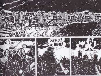 remarques: | album cartonné dans coffret, N&B, 80 pages d'après le roman de Jean Vautrin 1) préface de Vautrin: un roman populaire sur le Paris de la Commune en 1871 sur une idée de justice sociale, un morceau d'histoire peu connue et Tardi était le dessinateur idéal et providentiel pour illustrer ce roman 2) l'insurrection dans le Paris de la République de Monsieur Thiers en 1871, l'armée veut récupérer les canons passés aux mains des insurgés le commissaire Mespluchet enquête sur la noyée du pont de l'Alma tandis que les lignards (soldats) s'opposent à la populace qui veut garder ses canons >> p. 22 le flicard Grondin et l'anarchiste Fil-de-Fer le rendez-vous de Grondin, alias l'ex-bagnard Bassicousse, devenu flicard avec le chef des brigands La Joncaille par l'entremise du malfrat Caracole à noter: La Joncaille qui signe ses crimes avec un oeil de verre Grondin recherche l'officier Tarpagnan, lui aussi un ancien bagnard qui serait le meurtrier de la fille de Grondin la troupe chargée de ramener les canons se rallie à la populace alors que Grondin se fait étriper par la foule tandis que le capitaine Tarpagnan tombe amoureux de la Pucci, une fille qui appartient au caïd La Joncaille, alias Edmond Troncard >> p. 47 le mot basque: hitza hitz = la parole, c'est la parole >> p. 51 le tableau "l'origine du monde" Paris est maintenant aux mains des révolutionnaires, Grondin mal en point est récupéré et soigné par un vieux et sa vieille qui croient faire une bonne affaire avec Grondin >> p. 77 le défilé des pruscos qui ont choucrouté l'Alsace et la Lorraine >> p. 79 tandis que Tarpagnan arrive au repaire de La Joncaille pour retrouver sa belle Pucci au lieu dit "la tête à l'oeil de verre" >> l'adaptation du roman par Tardi sort un peu des sentiers battus de l'histoire et reprend quelque peu le thème du roman "les misérables", mais le récit reste plausible et intéressant, le tout raconté avec l'accent de l'argot parisien le graphisme est plutôt du genre relâché avec une fin d'album à la mode Adèle Blanc-Sec n.b. en annexe le cri du peuple façon belge Information le cri du peuple est une série de bande dessinée française en noir et blanc de Jacques Tardi, publiée par Casterman en quatre volumes sortis entre 2001 et 2004, elle est adaptée du roman éponyme de Jean Vautrin n.b. éponyme = qui donne son nom à l'action plonge en 1871 pendant la Commune de Paris, l'intrigue suit les aventures de différents personnages pris dans la tourmente des événement: - le capitaine Antoine Tarpagnan, passé du côté communard et amoureux de Caf’Conc’ - Caf' Conc', une prostituée et chanteuse parisienne de cabaret, aux mains d'un proxénète puis témoin de la Commune - Grondin, ancien bagnard à la recherche de Tarpagnan qu'il pense être le meurtrier de sa fille adoptive - Hippolyte Barthélémy, policier avide d'avancement tentant de résoudre son enquête l'auteur fait aussi apparaître des personnes réelles mêlées à la Commune, notamment Jules Vallès et Louise Michel, tous deux communards ainsi que, plus brièvement, Georges Clemenceau, maire de Montmartre en 1871 ou Gustave Courbet, peintre, des événements historiques sont relatés, comme l'abattement de la colonne Vendôme, symbole du bonapartisme ou encore la destruction de l'Hôtel de Ville par les communards ces personnages et leurs parcours sont surtout un prétexte pour raconter l'histoire de la Commune de Paris, les espoirs qu'elle a suscités et la répression qui s'est abattue sur les communards (ou communeux) lors de la semaine sanglante |