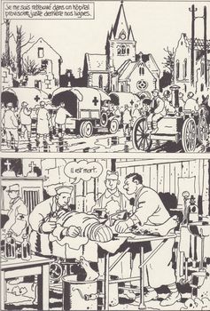 remarques: | cet album inédit de Tardi et Daeninck est le prolongement de Der des Ders (paru chez Casterman), dont il développe une des séquences, l'aversion de Tardi pour la guerre de 14/18 est ici a son comble (tout comme putain de guerre) le soldat Varlot étrenne ses 20 ans dans une tranchée de la 1ère guerre mondiale, suite à un éclat d'obus, il est transféré à l'arrière >> p. 11/12 la chanson complète de Craonne arrêté comme agitateur, Varlot assiste à l'exécution de soi-disants traîtres à la patrie >> p. 15 on confiait alors les exécutions à des bleus fraîchement arrivés, car les poilus auraient plutôt eu tendance à tirer sur l'officier qui donnait l'ordre de tirer sur le condamné Varlot réussit à s'enfuir lors d'un bombardement et en profite pour remettre la lettre d'un collègue adressée à sa femme en territoire occupé, il ne se rendra pas compte que cette femme travaille dans un bordel alimenté par des boches et au retour, sans le vouloir vraiment, Varlot (ou Charlot) soldat se retrouvera dans sa tranchée, putain de guerre >> petit album avec un récit sans prétention qui profite surtout du graphisme maintenant bien rôdé de Tardi n.b. un deuxième album de ce genre a été publié avec le titre de "le der des ders" (non collectionné ici) Information Varlot soldat est une bande dessinée française de Jacques Tardi (dessin) et Didier Daeninckx (scénario), publiée en 1999 chez l'éditeur l'Association, le héros, Varlot, est poilu dans l'armée française durant la 1ère Guerre mondiale, en première ligne durant la guerre des tranchées, l'album suit son aventure, tragique, comme il y en eut des millions à cette époque-là la première guerre mondiale est le sujet favori de Jacques Tardi auquel il a consacré plusieurs albums, la guerre n'est jamais décrite du point de vue stratégique, celui des généraux et de leur état-major, mais toujours au niveau du simple soldat sur le terrain, de ses souffrances et souvent de sa mort, de son côté, Didier Daeninckx s'est fait une spécialité de faire revivre des moments peu glorieux de l'histoire de France, ceux que l'historiographie officielle s'efforce de passer sous silence le titre est un jeu de mots sur Charlot soldat (1918), un film de Charlie Chaplin présentant la guerre sous un jour humoristique, totalement à l'opposé de la vision tragique de Jacques Tardi |