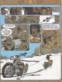 remarques: | réédition belge 1982 sa moto abandonnée par manque d'essence et perdu dans l'immensité himalayenne, Jonathan est sauvé par un yak solitaire >> p. 7 seul dans la neige (une jolie vignette) Jonathan découvre alors un chinois rescapé d'un avion qui s'est écrasé dans la montagne, Jonathan le soignera et lui laissera le yak comme moyen de transport; avec l'essence trouvé dans l'avion, Jonathan décide de continuer seul son voyage en moto, mais finalement, le chinois refusant de retourner dans son pays, Jonathan décide de traverser avec lui la chaîne de montagne vers le Népal sur leur chemin, les deux hommes sont guidés par un son mélodieux qui les conduit vers >> p. 23 une source d'eau chaude parmi les glaces n.b. cette source sera reprise dans les alpes valaisannes avec l'album "à la recherche de Peter Pan" où une jeune fille les accueille en leur transmettant par télépathie le chant de la montagne rencontre avec les résistants tibétains khambas à qui Jonathan offre comme prix de passage le chargement d'armes contenu dans l'avion échoué mais des troupes chinoises sont également à la recherche de l'avion perdu s'en suit une bagarre générale durant laquelle Jonathan est sauvé par son ami chinois qui récolte la balle destinée à Jonathan et avant de mourir, le chinois demande pardon à Jonathan parce qu'il fit partie en son temps du raid aérien qui causa la mort de Saïcha le destin ayant épargné Jonathan, celui-ci reprend le cours de son voyage >> à nouveau, un scénario sans grande surprise, mais avec un graphisme bien présenté n.b. il y aura en tout 17 albums parus dans la série Jonathan - tome 1 souviens-toi Jonathan, 1977 - tome 2 et la montagne chantera pour toi, 1978 - tome 3 pieds nus sous les rhododendrons, 1978 - tome 4 le berceau de Bodhisattva, 1979 - tome 5 l'espace bleu entre les nuages, 1980 - tome 6 Douniacha il y a longtemps, 1980 - tome 7 Kate, 1981 - tome 8 le privilège du serpent, 1982 - tome 9 Neal et Sylvester, 1983 - tome 10 Oncle Howard est de retour, 1985 - tome 11 Greyshore island, 1986 et 11 ans après - tome 12 celui qui mène les fleuves à la mer, 1997 - tome 13 la saveur du Songrong, 2001 - tome 14 elle ou dix mille lucioles, 2008 - tome 15 Atsuko, 2011 - tome 16 celle qui fut, 2013 - la piste de Yéshé, 2021 mais seuls les tomes 1,2,10 et 11 sont collectionnés ici comme exemplaires représentatifs de la série |