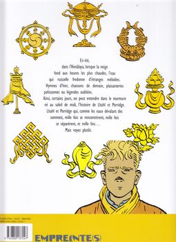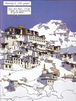 remarques: | un chasseur revient blessé des massifs de l'Himalaya, soigné par le dr Feeney, il meurt malgré tout de ses blessures en mentionnant le Bouddha d'Azur un peu plus tard, dans l'Himalaya, un bébé tibétain dont la mère est morte de froid, est recueilli par une ourse noire dont l'ourson a été tué par le chasseur quelques années plus tard, le bébé devenu une fillette sauvage est recueillie à son tour par un vieux moine d'une lamasserie dans une grotte contenant le Bouddha d'Azur, le moine considère alors la fillette comme une LHAHL 8 ans plus tard en 1963 à Calcutta, le jardinier tibétain Songtsen quitte son travail pour retrouver des parents au Tibet, le fils de ses employeurs, Gifford, décide de l'accompagner Songtsen capturé par les chinois, Gifford réussit à s'échapper et échoue dans un refuge où il trouve des manuscrits du dr Feeney mentionnant des plantes médicinales "le leontopodium stracheyi = genre d'Edelweiss de l'Himalaya" ce fut véritablement une traversée des enfers >> p. 27 les manuscrits du dr Feeney perdu dans la montagne, Gifford sera sauvé par des moines qui l'amènent au monastère de Chôd gampa (gampa = monastère) >> p. 31 le monastère de Chôd gampa à Chôd gampa, il apprend que ce serait un yéti qui aurait guidé vers lui ses sauveteurs et que c'est le dr Feeney qui aurait aménagé l'ermitage où Gifford a trouvé refuge et que le dr Feeney étudiait les plantes médicinales de l'Himalaya, mais qu'il cherchait aussi le bouddha céleste, dit le bouddha d'azur = une statuette sacrée très ancienne, symbole tibétain qui serait gardée par une LHAHL TULKU = réincarnation d'une grande mystique du passé lors de son séjour à Chôd gampa, Gifford fera la connaissance >> p. 52 dans une source d'eau chaude n.b. sic de la source dans l'album à la recherche de Peter Pan et dans celui de Jonathan, la montagne chantera pour toi, décidément Cosey aime les sources d'eau chaude de LHAHL, la 5ème incarnation de la Grande Lhal qui aurait redécouvert le bouddha d'azur et qui vit maintenant retirée dans le monastère de Chôd gampa Gifford se lie d'amitié et développe une histoire d'amour pour cette Lhahl, mais l'avance des chinois oblige Gifford à quitter le monastère et surtout quitter avec tristesse sa petite Lhahl d'amour qui elle décide maintenant d'abandonner son statut de tulku >> un récit où on nage littéralement dans le mystique et dans lequel on a bien de la peine à suivre les traces du Bouddha d'azur et où seul le graphisme de Cosey reste intéressant bien que le dessin soit quelque peu relâché par rapport aux séries précédentes, notamment celle de Jonathan n.b. tsampa = farine d'orge grillée Information un jeune anglais, habitant en Inde dans les années soixante, fugue pour échapper aux écoles de la lointaine et pluvieuse Albion et à leur porridge, en accompagnant clandestinement le chauffeur tibétain de la famille Cardboard, il va croiser la route du Yeti et finir recueilli dans un monastère tibétain, hors des livres scolaires, il va apprendre l'amitié avec Chogyam et Namgyal et découvrir une toute autre philosophie de la vie, mais l'insatiable curiosité de "Porridge" va l'amener face à Lhahl, une jeune fille gardienne du Bouddha d'Azur, Bouddha mythique qui n'est apparu que de rares fois dans l'histoire humaine, aux portes du monastère, la rumeur du monde ne va pas tarder à se faire entendre, en 1962, la Chine est en train d'envahir le Tibet |