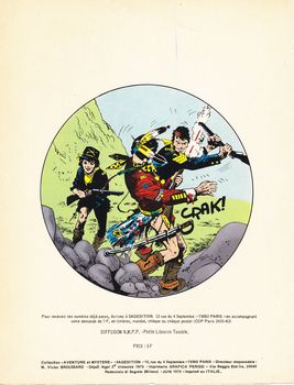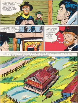 remarques: | premier album de la série sergent Kiri avec 2 épisodes: 1/ la vallée perdue et 2/ la longue chasse préface sur sergent Kirk par Gianni Bono Pratt raconte l'histoire d'un soldat de l'armée nordiste qui déserte et dénonce les injustices et cruautés des blancs durant les guerres indiennes, Sgt. Kirk devient alors le défenseur des indiens et autres opprimés 1/ la vallée perdue Kirk et ses amis - Maha, le jeune indien, adopté par Kirk - Lecourt, soldat nordiste qui a rejoint Kirk - le docteur Forbes qui accompagne Kirk tous doivent se défendre dans leur ranch de la vallée perdue contre des indiens, voleurs de chevaux 2/ la longue chasse sur la piste du bandit José "il recordato" qui aurait dévalisé la banque de Tucson, mais après une enquête serrée, il s'avère que ce n'est pas José le coupable, mais le banquier Collins et son fils Martin qui ont dévalisé leur propre banque et mis le hold-up sur le compte du pauvre José (qui est quand même un dur à cuire) >> p. 28 la discussion explicative avec José il recordato (de l'italien ricordare "récupéré") >> assez bon graphisme et un scénario intéressant n.b. cet album est le premier de la série sergent Kirk, il y en aura en tout 7 de parus chez Sagedition (1975-1978) et 5 chez les Humanoïdes (1984-1987), seul le tome 1 Sagedition est collectionné ici comme exemplaire représentatif de la série, les autres albums des éditions Sagedition: 1977 - tome 2 le bateau du Missouri 1977 - tome 3 la poursuite 1977 - tome 4 le secret de Wahtee 1977 - tome 5 le tonnerre rouge 1978 - tome 6 la montagne des esprits 1978 - tome 7 Tuskar le cruel |