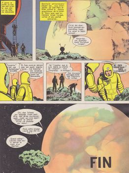 remarques: | le 4ème album de la série, album EO dernier titre: Mr. Barelli ce récit comprend 2 parties a) le rétablissement du pilote Marc Collins, qui durant la 2ème guerre mondiale subit un choc et qui souffre toujours encore de troubles psychiques, il sera guérit par Dan Cooper b) l'opération cap sur mars avec un cosmos astronef qui s'envole pour Mars à la vitesse de 100'000 km/seconde = 360 mio de km/h l'expédition est un succès, mais suite à la ceinture magnétique de Mars, les cosmonautes devront se contenter de se poser sur le satellite martien Deimos d'où ils découvriront un magnifique spectacle de Mars et où poussent des lichens >>> l'album s'arrête sur cette arrivée et il n'y aura pas de suite par Weinberg de cet épisode, surtout intéressant en deuxième partie |