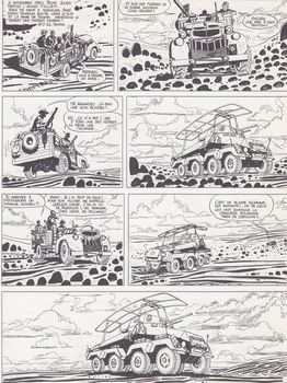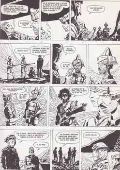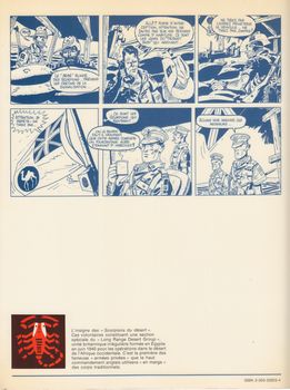remarques: | album originale broché, N&B, 112 pages Afrique du Nord, 1940 prologue sur Hugo Pratt, le romancier de la bande dessinée par Didier Platteau les scorpions du désert = section du "Long Range Desert Group" dont une section existe encore: le S.A.S. special air service les personnages: - Koïnsky, lieutenant polonais juif du Polish army corps (l'équivalent de Corto Maltese) - Hassan Beni Muchtar, bédouin libyen de la tribu des Sénoussis - Kord, des Royal Hussards, espion au compte des italiens - Judittah Canaan, agent juive de l'Irgoun - Stella, lieutenant italien en Ethiopie - Cush, chamelier danakil en Ethiopie, ami de Corto Maltese album en 5 épisodes 1/ R.A.S. à Djaraboub (frontière libyenne/égyptienne) le raid sur Djaraboub où l'on apprend qu'il y a un traître dans l'armée anglaise 2/ la piste de Siouah retour dans les lignes anglaises à Siouah après de premiers engagements avec des éclaireurs de l'Afrikakorps et de l'aviation amie et ennemie 3/ direction le Caire par le train "l'orgueil de Marsa Matrouh" règlement de compte chez les scorpions du désert, mort de Judittah assassinée par Kord, Hassan est grièvement blessé, mais s'en sortira et Kord sera finalement éliminé par Koïnsky après une course-poursuite épique et aérienne >> p. 48 l'attaque des italiens des services spéciaux déguisés en bédouins du désert >> p. 66 déjà le problème palestinien qui fait surface 4/ j'ai deux amours, mon pays et Paris (by Joséphine Baker) Khartoum 1941, l'attaque par l'armée anglaise munie de chars Matilda sur le fort de Wadi Setit, la brigade Gideon venant du Kenya libérant l'Ethiopie et ramenant l'empereur Haïle Selassié Stella fait connaissance avec Koïnsky et lui offre de partager un trésor après avoir ramené sa maîtresse Breda à Kura, mais Breda est partie et au retour, Stella et Koïnsky sont capturés par des brigands caftas >> p. 73 les chars Matilda de l'armée anglaise 5/ l'ange de la mort Cush, le mystérieux danakil, le froid calculateur de la tribu des Beni amer, délivre Koïnsky et Stella afin de retrouver le trésor dérobé par Stella aux Beni amer après avoir récupéré le trésor, Cush abattra Stella, mais laissera Koïnsky regagner l'armée anglaise >> une magnifique fresque sur la guerre du désert, un bon graphisme et surtout un bon texte et scénario n.b. une nouvelle collection des scorpions du désert en couleur sera édité par Casterman dès 2013 Information les scorpions du désert (italien: gli scorpioni del deserto) est une série de bande dessinée de guerre créée par l'Italien Hugo Pratt et publiée à partir d'octobre 1969 dans le mensuel Sgt. Kirk traduite en français dans le journal Tintin à partir de février 1973, elle a fait l'objet de plusieurs albums aux éditions Casterman la série se déroule au début des années 1940 en Afrique du Nord, pendant la campagne d'Afrique, ses personnages principaux sont les membres d'une section d'élite britannique du Long Range Desert Group dirigée par le Polonais Koinsky, elle est inspirée de faits réels après le dernier album de Pratt (brise de mer), la série a fait l'objet de deux reprises, l'une en 2005 (le chemin de fièvre) par le français Pierre Wazem et l'autre en 2007 (quatre cailloux dans le feu) par les italiens Matteo Casali et Giuseppe Camuncoli (ces deux albums ne sont pas collectionnés ici) |