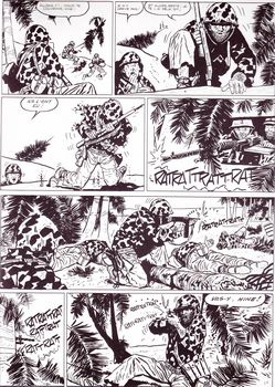 remarques: | en 1957, Pratt rencontre le scénariste Hector Oesterheld qui va changer le cours de sa carrière, ensemble, ils réalisent divers récits dont Ernie Pike que dessinera Hugo Pratt Ernie Pike = correspondant de guerre, ces chroniques se basant sur celles du correspondant de guerre Ernie Pyle qui a bien existé et qui est décédé le 18.4.1945 près d'Okinawa, ses chroniques furent publiées durant la guerre et on en tira même un film "the story of G.I. Joe" les histoires dessinés d'Ernie Pike rejoignent directement les chroniques de Pyle de par le style et le ton du récit ainsi que par leurs intentions antirhétoriques ce premier cahier comprend 8 épisodes: 1) poilu front de Normandie 1944, souvenirs d'un officier allemand lors de l'offensive de 1940 l'hôpital mystérieux abandonné et l'histoire du vieux poilu de 1914 2) la blessure à 1 million de dollars front du Pacifique, débarquement à Tarawa, l'histoire du soldat Cramer, l'action courageuse de Cramer qui lui cause la blessure à 1 million de $ = blessure pas assez grave pour rester mutilé mais suffisante pour le faire revenir à l'arrière du front 3/ destins croisés Gertrud Casey, lieutenant à la WAC en route pour Bastogne durant l'offensive des Ardennes qui tombe amoureuse de son type d'homme préféré 4/ une aventure dangereuse Guadalcanal, l'aviateur Franley s'échoue dans la jungle et est sauvé par Taro, chef du Fidjian commando qui lui envoie par la suite régulièrement la tête de ses ennemis abattus 5/ Tarawa l'attaque de la casemate japonaise, Melvin le peureux vengera la mort de ses camarades 6/ bottes front russe 1944, le soldat Hans Kessler, un pessimiste qui a de la chance 7/ combat le combat d'équipe sur une île du Pacifique >> p. 48 Banzai, la charge des fantassins japonais 8/ les dix-sept de la sapinière dans l'Italie du Nord enneigée, une compagnie de soldats brésiliens (?)sont massacrés par les allemands pour ne pas vouloir les renseigner sur leur action >> des chroniques courtes, mais originales et intéressantes Information Ernie Pike est un reporter de fiction créé par le dessinateur italien Hugo Pratt et le scénariste argentin, Héctor Oesterheld, en 1957 correspondant de guerre pendant la seconde guerre mondiale, il décrit dans ces récits les opérations qu'il couvre dans le Pacifique, l'Afrique et l'Europe, là où bien souvent les hommes se révèlent dans des actions de bravoure autant qu'à des actes de traîtrise Héctor Oesterheld s’est inspiré des reportages du journaliste américain Ernest Pyle, tué par les Japonais à Okinawa, le 18 avril 1945, Hugo Pratt a dessiné le reporter à la ressemblance de l’auteur des scénarios |