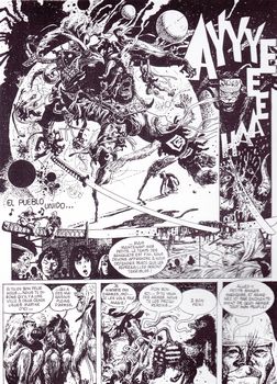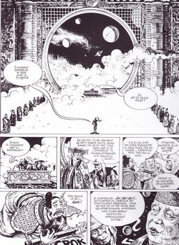 remarques: | album originale 1999, N&B, 90 pages, réédition de l'album "le singe" paru en 1980, en collaboration avec le scénariste Silverio Pisu, récit inspiré peut'être de Fellini un jeune singe issu de la roche, du ciel, de la terre et de la lumière veut fonder un royaume céleste, mais cela ne lui suffit pas, il veut devenir immortel il part alors aux confins du monde à la recherche de l'immortalité, il arrive chez les sages de la montagne et y fait un apprentissage durant lequel il acquiert l'immortalité, puis il retourne dans son royaume qu'il retrouve dévasté par un démon du nord >> p. 33 la bête le roi-singe quitte alors sa terre de la tenture d'eau pour aller demander des armes aux puissances de la mer afin de lever une armée, mais entretemps une erreur d'identification sur sa personne le conduit aux enfers >> p. 41 les enfers selon Manara le roi-singe raye alors son nom de la liste des mortels (puisqu'il est immortel), mais s'attire de ce fait la colère de l'empereur de jade = Dieu qui ordonne de le détruire >> p. 45 le roi-singe qui se retrouve façe à Dieu comme on ne peut pas le détruire (puisqu'il est immortel), Dieu le nomme inspecteur immortel des écuries impériales, mais pour avoir abandonné son poste, l'empereur de jade lance son armée contre lui, comme le roi-singe ne peut à nouveau pas être détruit (il est immortel), l'empereur se résoud à le nommer grand sage, l'égal du ciel, mais après une nouvelle colère, l'empereur de jade demande à Bouddha de le débarrasser du roi-singe, Bouddha envoie alors un puissant mage combattre le roi-singe >> p. 69-72 le duel entre le roi-singe et le puissant mage cochon Ehrlang le roi-singe est capturé et livré à Bouddha qui finalement arrivera à l'éliminer, mais un grand monument funéraire sera élevé au roi-singe >> un album plus qu'absurde avec de nombreuses singeries, avec toutefois un assez bon graphisme et une jolie couverture d'album malgré un scénario illuminé et bêta annexes - couverture, page de garde et extraits de l'album - couverture du premier album 1980 |