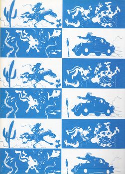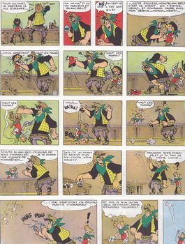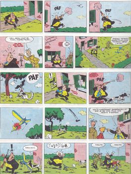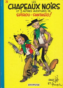 remarques: | réédition 1972, dos rond bleu, dernier titre: du glucose pour Noémie, 61 pages, titre complet: les chapeaux noirs et trois autres aventures, retour aux petites cases pour cet album 1/ les chapeaux noirs (1950) reportage au Texas pour Spirou et Fantasio qui habillés en cow-boy sont surnommés les chapeaux noirs, démêlés avec les frères Smith, après quoi les chapeaux noirs sont nommés vice-shérifs de Tombstone, combat avec Jack le Géant, puis Spirou et Fantasio apprennent que tout cela n'était qu'une farce arrangée par un producteur de cinéma, mais ce fut quand même une belle aventure >> p. 6 les plaines où circulent des troupeaux de bisons innombrables 2/ comme une mouche au plafond (by Jijé 1949) la suite des plans du robot Radar, Spirou se retrouve dans la situation d'une mouche marchant sur le plafond (en position de lévitation), mais c'est sous l'effet de l'emprise néfaste du magicien Abdaka Abraka, Spirou réussira à déjouer ses méfaits en se chaussant de souliers à semelle de plomb de scaphandrier 3/ Spirou et les hommes-grenouilles (by Jijé 1950) Fantasio, capitaine d'une barge de tourisme à Marseille, fait visiter les calanques à ses clients, démêlés avec la vieille dame anglaise suite à une panne d'essence dans les calanques où nos deux amis seront mêlés à une histoire de recherche de trésor durant laquelle il faudra trouver des preuves pour innocenter un voleur volé >> p. 34 Fantasio le fantaisiste 4/ mystère à la frontière (1950) affaire de contrebande aux stupéfiants où l'on utilise des avions miniatures téléguidés pour transporter la drogue, mais Spirou découvrira vite le pot aux roses >> un album très moyen, reprenant d'anciens épisodes en partie inédits, mais encore non parvenus à maturation, une petite étoile malgré tout |
