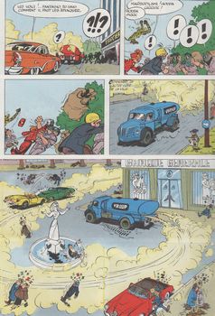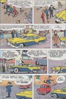 remarques: | réédition de 1972, dos rond bleu, dernier titre: du glucose pour Noémie, 62 pages, date originale 1958 premier épisode: les pirates du silence Fantasio est chargé d'un reportage à Incognito City, la ville des stars, mais entretemps le Marsupilami accourt de Champignac pour avertir Spirou et Fantasio que le comte de Champignac court un grand danger, mais ceux-ci en route pour Incognito City n'arrivent pas à joindre le comte >> p. 7 la course automobile entre la turbo et la décapotable de Juan Corto dos Orejas y Rabo >> p. 14 Incognito City, une ville bien gardée arrivés à Incognito City, nos deux amis trouvent à se loger chez un retraité vivant en ville (les hotels ne voulant pas du Marsupilami), durant la nuit, un effet d'écho étrange se déclanche à l'intérieur de la maison: c'est le Marsupilami qui est capable de répéter des paroles humaines n.b. Franquin constatera que c'était une erreur de vouloir faire parler le Marsupilami et ce sera la première et la dernière fois qu'on entendra parler le Marsupilami dont le langage se limitera désormais à Houba Houba Fantasio est enlevé, Spirou part à sa recherche et découvre aussi le comte de Champignac, également prisonnier de Juan Corto qui veut dévaliser la bijouterie et la banque de Incognito City en utilisant la formule X6 du comte (la formule du gaz soporifique) qui endormira toute la population (y compris la police) d'Incognito City, ce sera l'opératon silence: une ville endormie pour mieux pouvoir la cambrioler, mais Spirou fera échouer l'opération des malfaiteurs n.b. une affaire aussi d'appareils photographiques camouflés (dans la pipe et la montre de Fantasio) car à Incognito City, il est interdit de photographier deuxième épisode: la Quick Super les vols de voiture se succèdent, Spirou et Fantasio mettront à jour les activités d'une bande organisée par les anciens du cirque Zabaglione (le directeur, Goliath le géant et le nain) >> p. 50 la Buick spécial de GM (= Genial Motors) >> un scénario pas trop recherché, mais restant intéressant avec de superbes dessins de voitures |