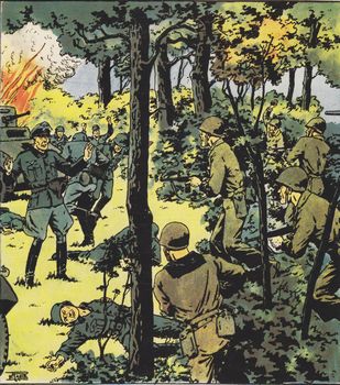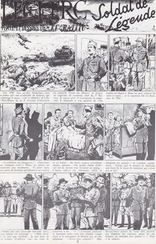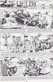 remarques: | album N&B, Curiosity Selection no. 4, édition Deligne, 62 pages, 1977 l'épopée de Philippe de Hautecloque, appelé colonel Leclerc et de la 2ème DB, couverture: le colonel Leclerc durant la bataille du Fezzan n.b. Fezzan = région sud-ouest de la Lybie un assez bon scenario, une bonne fresque de guerre, mais sans la couleur, le graphisme tombe presque à zero et ne peut en aucune façon être comparé aux bandes parues dans le Journal Tintin française de 1948 en outre cette série dans le Journal Tintin comportait également de nombreuses magnifiques couvertures en couleur des fascicules, notamment le no 1 (reproduit ici comme couverture de l'album) il faut lire ces bandes parues dans le Journal Tintin pour en mesurer l'excellence de la qualité, notamment pour la couleur, toutefois le texte sous images est malheureusement difficile à la lecture (d'ailleurs idem pour l'album) cette bande a paru dans Tintin France et Tintin belge de septembre 1948 à juin 1949 le récit débute avec l'invasion de la France, puis Leclerc se retrouve à Londres avec le général De Gaulle qui lui confie le commandement des forces français en Afrique, Leclerc se fera connaître dans la campagne du Fezzan en battant les italiens, puis en formant la 2ème DB qui combattra sur sol français en libérant la première Paris et en continuant la campagne en Allemagne jusqu'à Berchtesgaden, - après avoir souvent bénéficié de sa baraka, Leclerc meurt bêtement à 44 ans dans un accident d'avion le 28.11.1947 en survolant le Sahara où il avait effectué la plupart de ses campagnes selon Louis, le scénariste, les français auraient gagné la guerre à eux seuls, les italiens sont des pleutres et les allemands pas très coriaces, mais il est vrai que cette bande dessinée parue peu de temps après la guerre constitue plutôt une gloire à l'armée française libre >> p. 4 la face brutale du boche >> p. 18 les français combattent en képi, mais les troupes noirs françaises sont casquées (p. 26) tout comme les italiens >> p. 24 la guerre en chameaux (dromadaires) et à cheval (p. 31) >> p. 33 Von Arnim est mentionné (Rommel ne le sera qu'une seule fois) >> p. 36 on rejoint Gibraltar à la nage >> p. 48 les marinettes >> p. 56 De Gaulle, impassible continue de prier pour la France (à Notre-Dame) >> p. 61 un drôle de canon 88 mm >> p. 64 retour des prisonniers français (la vignette n'est pas légendée) >> p. 65 le Furher (au lieu de Führer) et les 4000 véhicules de la 2ème DB >> p. 66 Leclerc, bon papa pour les indigènes le scénariste est un certain Roger Louis (complètement inconnu au bedethèque et à ne pas confondre avec Stéphane Louis) dont ce serait l'unique scénario, un scénario pour la BD Leclerc, soldat de légende, d'ailleurs peu élaboré, parfois même naïf et qui ne s'accorde pas toujours avec les vignettes de Le Rallic qui par contre fournit un graphisme talentueux qu'il faut surtout admirer dans la version couleur , n.b. un album de ce genre a paru aux éditions Lavauzelle en 1991, 29 pages couleur avec le titre la 2ème DB, le chemin de la liberté par le scénariste Albéric De Palmaert et le dessinateur Jean-François Biard, entièrement en BD vignettes, mais moins élaboré annexes - couverture de l'album - couvertures de deux nos du Journal Tintin - 4ème plat de l'album - deux extraits de l'album - insigne de la 2ème DB - couverture de l'album 2ème DB, le chemin de la liberté Information - Philippe Leclerc de Hauteclocque, plus connu comme le général Leclerc (1902-1947) est l'un des principaux chefs militaires de la France libre durant la Seconde Guerre mondiale, figure majeure de la Libération, il est notamment connu pour avoir commandé la deuxième division blindée - officier anticonformiste et brillant, il se révèle un stratège et un organisateur hors pair, fait prisonnier en 1940 pendant la bataille de France, il s'évade et rejoint l'Angleterre, il prend alors pour nom de guerre Leclerc, il rencontre à Londres le général de Gaulle, qui lui confie pour mission de rallier l'Afrique-Équatoriale française à la France libre, après y être parvenu, il remonte vers la Libye, où il prend l'oasis de Koufra, malgré l'infériorité numérique de ses troupes, il prononce alors le serment de Koufra: jurez de ne déposer les armes que lorsque nos couleurs, nos belles couleurs, flotteront sur les cathédrales de Metz et de Strasbourg - après plusieurs batailles dans le Maghreb, la colonne Leclerc stationne au Maroc en 1943 où elle prend le nom de 2ème division blindée (DB), en août 1944, son unité prend part à la bataille de Normandie, puis est la première unité à entrer dans Paris lors de la libération de la capitale, le 23 novembre 1944, la 2ème DB libère Strasbourg |