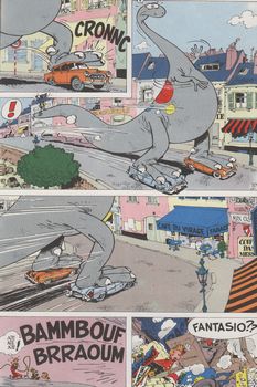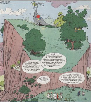 remarques: | album original 1960, dos rond papier pincé crème, dernier titre: le voyageur du mésozoïque, 63 pages, premier épisode: le voyageur du mésozoïque l'Antarctique où le comte de Champignac expérimente une nouvelle formule X7 qui rend insensible au froid; par la même occasion, découverte d'un oeuf dinosaurien, âgé de 50 millions d'années qui est ramené en Europe conférence de savants (dont le savant atomiste Sprtschk peu apprécié par Champignac et qui mourra, à la veille d'inventer une nouvelle bombe atomique, avalé par le dinosaure) l'oeuf est identifié, c'est un oeuf de plateo-saurus qui donne naissance à un jeune plateo-saurus qui attrape malheureusement le rhume de Fantasio >> p. 10 le rhume de Fantasio = terrifiant mariage de la reine des cuites avec le roi des rhumes mais à la suite d'un dosage erroné de la formule X2, la croissance du jeune plateo-saurus est accélérée et il devient vite un adulte gigantesque qui quitte le domaine de Champignac pour se rendre au village de Champignac en causant de grands dommages sur son passage >> p. 18 le platéosaure tâcheté dans toute sa splendeur on cherche alors à détruire le platéosaure, l'armée n'arrive à rien, une attaque aérienne ne donne aucun résultat, les mouvements écologiques et la protection des animaux interviennent en faveur du platéosaure et ce sera finalement le Marsupilami qui stoppera la marche dévastatrice du mastodonte finalement, on réussira à parquer le platéosaure dans un environnement protégé et il deviendra l'attraction principal de Champignac (mais on n'en entendra plus parler dans les prochains albums) >> p. 46 Longtarin, constructeur de ponts et autres armatures en tout genre >> p. 47 le premier parc jurassique de Champignac-en-Cambrousse >> p. 48 les célèbres discours du maire de Champignac dont "agriculture, commerce et tourisme sont les deux mamelles qui sèment le pain dont le Champignacien abreuve ses enfants" deuxième épisode: la peur au bout du fil le comte expérimente à nouveau sa formule X5, mais il se trompe de formule et avale un poison qui le transforme en un fou furieux humoristique, heureusement, son collègue biologiste réussira à lui injecter un antidote qui arrêtera le comte dans sa folie de tout détruire avec le Métomol concentré >> un album au récit très paléolithique, cocasse et bien imaginé, surtout le premier épisode avec toujours un excellent graphisme, un Godzilla prématuré |