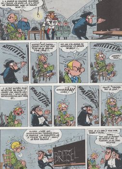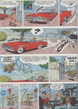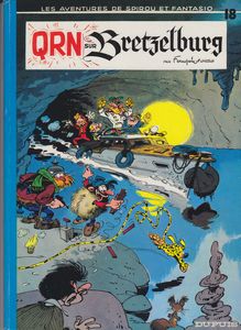 remarques: | réédition de 1972, dos rond bleu marin, dernier titre: du glucose pour Noémie, 63 pages, date originale 1966, collaboration avec Greg un transistor miniature est avalé par le Marsupilami, puis remonte dans son nez tout en continuant de fonctionner, Spirou et Fantasio subiront ainsi 24 heures de musique totale, finalement, c'est le Marsupilami qui trouvera la solution en s'assommant et en détruisant ainsi le transistor rencontre avec le radio amateur, Marcelin Switch, chercheur de QRN (indicatif radio de Bretzelburg) qui vient de capter un SOS de Bretzelburg où la royauté est menacée, la radio de Switch a toutefois été brouillée par les interceptions du transistor avalé par le Marsupilami n.b. à noter les réflexions de Spip de plus en plus nombreuses et l'accent germanique des Bretzelburgeois >> p. 16 petite moquerie sur la BD alors que Fantasio est enlevé par la Bretzelgeheimpolizei Spirou décide de se rendre au Bretzelburg avec le sieur Switch à la rescousse de Fantasio, le Marsupilami restant dans un hôpital pour animaux afin de soigner son nez opéré pour enlever le transistor >> p. 22 le trajet pour le Bretzelburg: Paris, Basel, Zurich, Krollstadt = capital du Bretzelburg (Liechtenstein?) au Bretzelburg le général Schmetterling, chef d'armée, demande toujours plus de moyens militaires au petit roi Ladislas (drogué par Schmetterling et son complice) pour attaquer le petit royaume voisin du Maquebasta Fantasio prisonnier à la forteresse de Schnapsfürmich est interrogé par le dr. Kilikil >> p. 36 entretemps, après une courte convalescence, le Marsupilami rejoint nos amis au Bretzelburg Fantasio est délivré, rencontre avec la résistance bretzelburgeoise >> p. 35/36 un chien policier tenace >> p. 57 rencontre avec la résistance bretzelburgeoise à la fin, les agissements de Schmetterling et de son complice sont démasqués et le roi Ladislas de Bretzelburg peut enfin lier des relations suivies avec le Maquebasta en mariant la princesse Farfalla >> p. 42/43 les dons culinaires de l'ex bourreau, le dr Kilikil >> un album satire sur les dictatures, quelque référence au nazisme, un bon album, mais c'est un autre genre qui prend le pas dans la série, autant pour le graphisme (plus petites cases) que pour le scénario (un peu surchargé et trés comique), on pressent que Franquin veut se consacrer maintenant à sa série favorite de Gaston et à d'autres idées (idées noires) n.b. dans cet album, une part appréciable du récit est consacré à Spip (vu que le Marsupilami sera gardé par Franquin) |