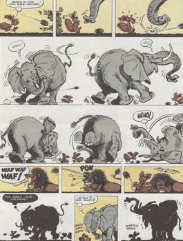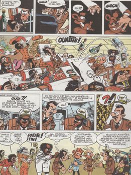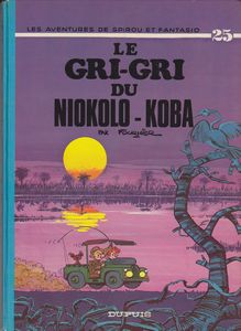 remarques: | édition originale, dos rond bleu, dernier titre: Tembo Tabou, 46 pages Sénégal, parc national de Niokolo Koba avec Mansa Moussa le féticheur et son neveu Tuté Tougouré aux prises avec des bandits qui veulent s'approprier le gri gri du féticheur, le gri gri est confié à Tuté Tougouré qui lors d'un voyage en Europe est à nouveau pris à parti par les bandits et qui confie par hasard le gri gri à Spirou et Fantasio >> p. 3 le diamant de Koli qui fait disparaître temporairement les humains et les animaux Spirou et Fantasio partent alors pour le parc de Niokolo Koba afin de rendre le gri gri au féticheur, rencontre avec Sêté Bagaré, un autre cousin de Mansa Moussa qui entretemps a été enlevé par les bandits péripéties de Spirou et Fantasio dans la réserve de Niokolo Koba, réapparition de la journaliste Ororéa qui mène sa propre enquête dans la brousse, finalement, les bandits seront neutralisés, Mansa Moussa, délivré, révèle le secret du gri gri qui contient les plans d'un gisement diamantifère dans la réserve >> p. 34 la termitière amovible = le repaire des bandits >> p. 45 le chef des bandits l'écossais Pluchan Park >> un album qui aurait pu être original mais qui se perd en gags loufoques et désordonnés, toutefois le graphisme est très bon pour cet album avec un coloriage idem et une jolie couverture d'album n.b. B+ parce que légères traces de scotch au milieu de l'album mais n'empiettant pas sur les illustrations, côte BDM Euros 60.- en BE |