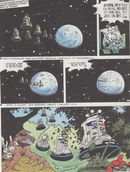 remarques: | édition originale, dos carré jaune, dernier titre: le gri gri du Niokolo Koba, 46 page des OVNI à Champignac, les animaux sont affolés par le langage à ultra-son des extra-terrestres >> p. 3 Spirou a échangé sa Honda contre une Lotus >> p. 7 première rencontre avec l es aliens, ce sont des Ksoriens en stage de mycologie chez le comte de Champignac et qui adorent boire du cidre péripéties avec les Ksoriens que des agents étrangers veulent enlever >> p. 38 le relais ksorien Ksor II en satellite autour de la Terre >> p. 40 une page complète de discours du maire de Champignac (cette fois un peu trop pompeux et devenant lassant); finalement tout redeviendra calme, les Krosiens repartent, mais reviennent peu après incognito chez Champignac pour déguster à nouveau du cidre >> un début de série prenant la science-fiction comme thème, une idée assez originale, mais peu développée, surtout pour le scénario, pas de quoi réveiller un krosien, même avec du cidre |