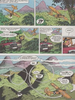 remarques: | album original, dos carré blanc, dernier titre l'Ankou, 46 pages Spirou et Fantasio cherchent à faire un reportage sur l'état de Catung, gouverné par le dictateur fou Jataka Kodo financé par l'organisation de la mafia, nos amis prennent les services du pilote ivrogne John Madflying >> p. 10/11 le vol mouvementé vers le Catung parachutés dans la jungle, nos amis sont séparés, et par le plus grand des hasards, Fantasio prend la place d'un inspecteur de la mafia venu rendre visite au dictateur Kodo alors que Spirou est fait prisonnier, mais celui-ci est un peu plus tard délivré par les rebelles catungais qui lui apprennent que le Catung est un champ de pavots à opium pour le trafic de cocaïne de la mafia >> p. 28 Kodo attaqué par des singes armés Spirou se joint à la résistance pour renverser Kodo alors que le pseudo-inspecteur Fantasio tente de semer le chaos chez le dictateur qui tente alors de l'éliminer sur le compte de la résistance lors d'une prochaine tournée d'inspection >> la suite dans le prochain volume >> un album qui recherche peut'être un remplaçant pour Zorglub, une idée originale avec un développement assez amusant, le tout couplé avec un graphisme respectable |