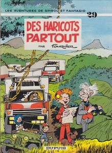 remarques: | édition originale, dos carré blanc, dernier titre: Kodo le tyran, 46 pages l'attentat sur Fantasio par les résistants et par les sbires de Kodo échoue de part et d'autre, mais Fantasio est enlevé par les rebelles et retrouve Spirou qui se rend chez Champignac pour lui demander son aide dans cette affaire >> p. 29 Champignac se rend aux Indes pour en discuter avec son ami, le prof. Sirk Hamar de l'OMS à Delhi afin de trouver une solution un plan de culture d'haricots est mis en place pour remplacer les pavots d'opium et suite à l'intervention musclée des rebelles, Kodo est abandonné de tous, mais réussit à s'enfuir avec Chopsuey son fidèle acolyte >> p. 30 Spirou pris pour un domestique Spirou et Fantasio retrouveront à Bruxelles Kodo, recyclé comme marchand de légumes, vendant les fameux haricots du Catung et >> p. 46 qui leur fera goûter ses fameuses tomates françaises bien mûres >> un album qui ne vaut pas un haricot, un dernier récit de Fournier un peu bâclé tant pour le graphisme que pour le scénario, malheureuse fin de série pour Fournier n.b. selon Fournier, Champignac pourrait se trouver pas loin de l'aéroport de Genève >> voir page 27 |