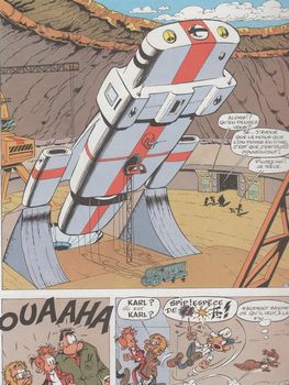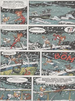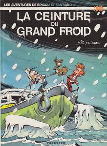 remarques: | la série est reprise 3 ans plus tard par le tandem Nic+Cauvin n.b. à partir de maintenant tous les albums auront des dos carrés blancs avec 46 pages Spirou en vacances au bord de la mer assiste à l'acquisition par Fantasio d'un super vieux rafiot et lors d'une tournée en mer, leur vieux rafiot est pris dans une tempête de neige (= la ceinture de froid) provoquée articiellement par un groupe de savants dirigés par Jefferson Singelway qui préparent une expédition interplanétaire >> p. 17/19 l'île artificielle, les souliers Pzo pour marcher sur l'eau et >> p. 19 la fusée spatiale interplanétaire la suite de l'album n'est qu'un combat entre Spirou et Fantasio avec l'équipage d'un sous-marin, venu pour capturer les savants, afin de permettre aux savants de terminer leurs préparatifs de départ et de s'envoler avec leur fusée pour une planète lointaine >> premier album qui laisse un grand froid et se révèle un parfait échec, le graphisme change à nouveau mais ne s'améliore pas et le scénario est vraiment très pauvre n.b. le graphisme de Fournier était nettement meilleur |