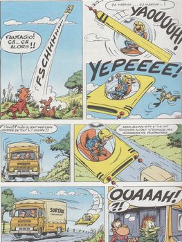 remarques: | suite de l'album précédent >> p. 3 tout comme Tintin, Spirou se modernise en utilisant maintenant la moto, réapparition du commandant Alexander du sous-marin qui poursuivait les savants du tome précédent Fantasio se lance maintenant à la découverte de la boite noire qui lui avait été laissée par les savants résidant actuellement sur une autre planète, cette boite noire contient de nombreux plans et inventions concernant des nouveautés techniques >> p. 10 expérience avec le Fantajet et la Fantabulle démêlés avec les malfrats qui veulent s'emparer de la boite noire et leurs péripéties conduiront les antagonistes juqu'au désert du Widji en Afrique Centrale >> un album sans intérêt(scénario) ni grande qualité (graphisme), décidément il n'est pas facile de continuer la série de Spirou et Fantasio |