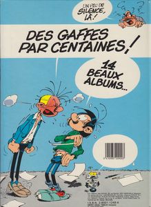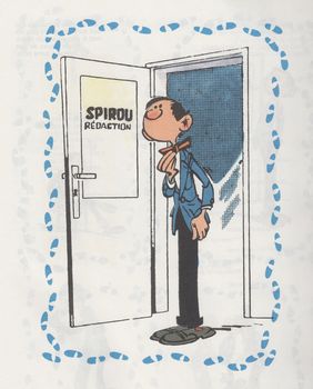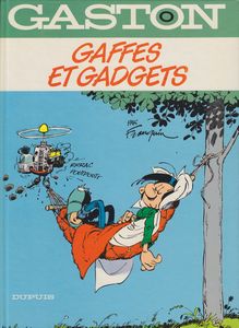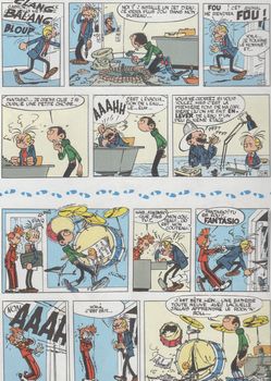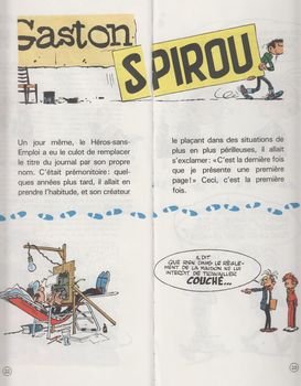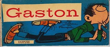 remarques: | Gaston Lagaffe, le héros-sans-emploi créé en 1957 par Franquin, Delporte et Jidéhem, une série qui comporte les sommets du comique en bande dessinée tome 0, édition originale, dos carré bleu, 48 pages, sans titre au 4ème plat sauf 14 beaux albums album historique reprenant les toutes premières publications de Gaston dans Spirou (1957) y compris celles publiées dans le premier mini-album, aujourd'hui d'une grande rarité - Gaston, le héros-sans-emploi, l'abominable, qui est vraiment trop bête selon Fantasio - la première image de Gaston parue dans le journal de Spirou et Fantasio - Gaston et les noix >> de nombreux petits gags anciens, originaux et en partie inédits des premières aventures de Gaston, un album d'archive avec un Fantasio, rédacteur en chef du journal annexes - couverture, 4ème plat et page de garde - extraits de l'album - le symbole Gaston la GAffe - couverture du tout premier tome à l'italienne (1960), valeur au BDM: plus de 1000 Euros Information Gaston est une série de bande dessinée belge humoristique créée en février 1957 par André Franquin, la série met en scène un employé de bureau nommé Gaston Lagaffe, travaillant au journal de Spirou, grand fainéant et commettant chaque semaine de nombreuses gaffes (913 au total) son supérieur sera d'abord Fantasio qui disparaîtra de la série quand Franquin arrêtera de dessiner les aventures de Spirou et Fantasio, il sera remplacé par Prunelle jusqu'à la fin de la série, parmi les gags récurrents il y a le Gaffophone, les contrats non signés avec M. de Mesmaeker, le Gaston-Latex-Géant, sa voiture, les appeaux ou encore la chimie amusante, bricoleur et inventeur, Gaston fabrique de nombreuses inventions qui échouent la plupart du temps à la suite d'une gaffe la série est d'abord publiée chaque semaine dans le journal Spirou, puis éditée en albums chez Dupuis jusqu'en 1992, depuis lors, elle est publiée par Marsu Productions, maison monégasque d'édition de bandes dessinées, l'ordre de publication, chronologiquement illogique, de la série originale des albums (0, 2, 3, 4, 1, 5, 6, 7, 8, R1, 9, R2, 10, R3, 11, R4, 12, 13, 14, R0, R5, 15) est dû à la non-réédition des premiers albums de la série sortis au format à l'italienne, cette décision amènera la série à ne pas avoir de no 5 (au format standard) pendant 20 ans; ce sera là l'origine de la légende de l'album fantôme, en 1997, les planches ont été triées chronologiquement et publiées dans 18 albums (plus un 19ème sorti plus tard et inédit dans l'édition originale), constituant ainsi l'édition définitive en 2018, Dupuis publie une nouvelle version de la série Gaston rangée complètement dans l'ordre de parution des planches dans le journal, accompagnée de nombreux gags inédits, expliquant les 21 tomes que comprend la série (+ le tome 0 présentant les premiers dessins de Franquin avant les premiers gags parus dans le tome 1) André Franquin donna naissance à Gaston Lagaffe au cours de l'année 1957, il était alors le dessinateur de la série Spirou et Fantasio dans le Journal de Spirou et aussi le dessinateur du rédactionnel automobile Starter ainsi que de la plupart des couvertures du magazine, de plus, il dessinait aussi chaque semaine une planche de la série Modeste et Pompon dans le Journal de Tintin il eut l'idée de créer un personnage de BD qui n'en serait pas un, un personnage qui n'aurait aucune qualité, qui serait bête, pas fort et moche, ce serait un héros sans emploi, il soumit l'idée à Yvan Delporte, alors rédacteur en chef du Journal de Spirou qui la trouva excellente, à cette époque, Delporte encourageait les membres de son équipe à collaborer, dès qu'un auteur comme Franquin, Peyo, Will ou Roba était bloqué dans une histoire, il faisait appel aux autres membres de l'équipe, Delporte se retrouvait au centre de cette collaboration et ses avis étaient toujours très importants ce personnage qui émergea de la tête de Franquin était au départ uniquement là pour faire de l'animation "à la petite semaine" dans le Journal de Spirou, la forme graphique de Gaston fut élaborée par Franquin, alors que sa personnalité fut créée avec l'aide d'Yvan Delporte, le nom de Gaston fut, lui aussi, trouvé par Delporte, d'après un de ses amis, un certain Gaston Mostraet, qui était gaffeur lui aussi, ce que Franquin oublia, c'est que son beau-père portait le même prénom; ce choix lui posera plus tard quelques problèmes familiaux, Gaston apparut le 28 février 1957 dans le no 985 de Spirou, cette première apparition n'est accompagnée d'aucun mot d'explication ou de titre, ce n'est qu'un dessin en noir et blanc dans un quart supérieur de la page, entouré de traces de pas, où il se tient timidement devant une porte ouverte sur laquelle est écrit "Spirou rédaction", il porte des cheveux courts et lisses, un pantalon noir à revers, une veste, une chemise blanche et un nœud papillon qu'il réajuste nerveusement, il a la bouche légèrement ouverte, ce qui sera effacé par erreur dans les publications en albums, les correcteurs pensant qu'il s'agit d'une tache d'encre la semaine suivante, toujours un seul dessin, un titre Gaston et les traces de pas l'accompagnant, plus détendu, il se tient les mains dans les poches devant la porte fermée de la rédaction, s'il garde le même costume que la semaine précédente, sa veste par contre est déboutonnée, il regarde autour de lui, un petit sourire aux lèvres sept jours plus tard, dans le Spirou no 987, il laisse tomber le costume pour ses légendaires vêtements, seules les espadrilles manquent, il a pour l'instant gardé les chaussures des semaines précédentes, assis sur une chaise, l'air nonchalant, il allume sa première cigarette |