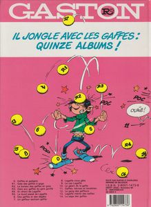 remarques: | édition originale, dos carré rouge, 48 pages, dernier titre au 4ème plat: R5 Lagaffe qui joue avec des boules de billard le lourd passé de Lagaffe qui joue avec des boules de billard nos 0, R1, R2, R3, R4, R5, 6, 8, 10, 11, 13, 15, 14, 15 = 14 boules >> p. 9 Gaston fait du hula-hoop >> p. 13 Gaston et son caméléon >> p. 28 Gaston et la dinde de Noël >> p. 39 le remplaçant de Gaston: Bertrand Labévue >> p. 42-47 planches de publicité avec Gaston pour la boisson Piedboeuf Orange >> pas beaucoup de nouveaux gags dans cet album réchauffé et commercial pour remplir un trou, celui du R5, mais quand même une bonne planche: page 40 avec le chat dingue, la mouette rieuse, Cheese la souris grise et Bubulle le poisson rouge |