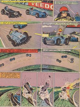 remarques: | l'action se passe maintenant au Grand Prix de Monaco où un mystérieux pilote X sur une voiture-fantôme concurrence Michel Vaillant, le duel entre la Vaillant et la Mystère continue au circuit de Francorchamps, de Reims et de Monza album 1960, 64 pages, dernier titre le grand défi valeur indiquée = 50% du BDM (Euros 150.-) n.b. le 4ème plat finit avec le titre du grand défi, mais contient 4 nouveaux albums non répertoriés dans le premier album (le grand défi) |