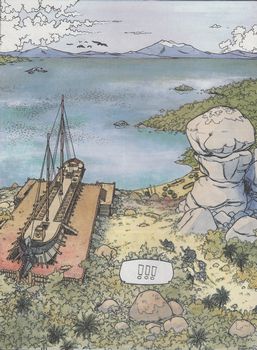 remarques: | les esclaves révoltés se mettent en route vers le Zimbabwe en emportant du butin et le sarcophage de Guise, derrière eux suivent Aryanne et Daho qui essaient de les rejoindre, Aryanne sait maintenant comment ranimer Guise mais Aryanne et Daho s'égarent et traversent le pays de la mort silencieuse habitée par des nains sanguinaires lors de leur périple, Aryanne et Daho découvrent auprès d'un lac un superbe navire: >> p. 16 la nef royale d'Atlantis >> p. 22 l'histoire de la nef royale selon les archives déchiffrées par Aryanne par la suite, Daho et Aryanne sont capturés par les nains, rencontre avec la vestale Kleya, seule survivante de la nef, devenue souveraine des nains qui doit copuler avec Daho pour assurer une descendance à la tribu des nains >> p. 27-29 les nombreuses copulations toutefois Daho et ses hommes avec Aryanne et Kleya réussissent à s'échapper et en s'emparant de la nef entament une navigation sur le Nil noir mais ils sont pris dans des chutes d'eau >> p. 44 la chute de la nef et s'échouent sur les rives du pays R wenda où ils sont capturés cette fois par une tribu de montagnards commandés par Orgui >> la suite des péripéties d'Aryanne avec force copulations et autres étreintes, scénario et graphisme restent faibles mais le coloriage est assez bien exécuté |