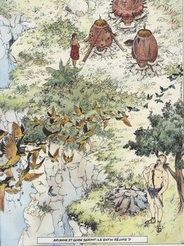 remarques: | la tribu des montagnards à Anzuza est attaquée par un détachement de ghouns = la dernière colonne, durant l'absence du chef Orgui tandis que Aryanne maintenant enceinte continue avec Daho et Orgui leur marche vers Anzuza et tombe dans le traquenard tendu par les ghouns Aryanne et Kleya sont capturées mais Daho et Ourgui réussissent à s'enfuir en plongeant dans le Nil noir >> p. 10 et 14 deux vignettes très érotiques Azioul, chef des ghouns, traite Aryanne avec bienveillance, les autres femmes étant suppliciées Daho et Orgui, rescapés, rejoignent les tribus de Zimbabwe pour rassembler une armée afin de contre-attaquer les ghouns de la dernière colonne Darak, le rival d'Azioul dans la dernière colonne, apprend la nouvelle que la cité des ghouns a été détruite et veut se venger sur Aryanne, il se débarrasse d'abord d'Azioul >> p. 40 le supplice d'Aryanne finalement la dernière colonne sera anéantie par les forces conjuguées de Daho, Orgui et Erg, fils d'Orgui Aryanne est libérée mais elle est gravement blessée, elle s'en sortira, mais son enfant vient au monde mort-né >> c'est aussi le dernier volume collectionné de la série, peu intéressante tant pour le scénario que pour le graphisme n.b. il y aura encore 4 albums parus dans cette série: - tome 6 le tueur de pluie 1990 - tome 7 les entrailles du paradis 1990 - tome 8 à l'aube des glaces 1991 - tome 9 la cité des sciences 1991 mais non collectionnés ici |