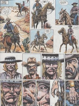 remarques: | du western mi-comique mi-satirique avec une préface de Ramaïoli sur le western et sur l'auteur, grand admirateur de Giraud album à 7 épisodes: 1) rencontre le duel manqué entre Kid Billy Lee et One Eyed Jack avec une bonne planche à la Sergio Leone en page 5 2) duel à Charity Town (avec Moebius) l'exécution du jeune Billy par Wyatt Earp 3) le duel à double feu en s'entretuant 4) une corde pour le bourreau "destin camalos" où l'exécution se retourne contre le bourreau malgré son habileté à faire les noeuds de chanvre pour les pendaisons, condamné et bourreau exécutés le même jour! >> p. 27 le festival de l'exécution 5) le nettoyeur épisode plutôt humoristique genre arroseur arrosé avec le nettoyeur pas nettoyé 6) le prix d'un indien satire sur Buffalo Bill et son cadeau original (un scalp) à sa douce lady mrs Louisa Frederici Cody sur fond de Custer à Little Big Horn >> p. 40 le scalp de Yellow Hand 7) noirs, blancs, gris, bleus l'injustice sociale et la vengeance manquée du pauvre noir Jasper en Louisiane lors de la guerre de Sécession >> petite satire sur le western, rien de très particulier, mais amusant et avec un bon graphisme |