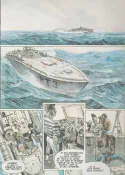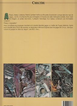 remarques: | prélude: aux Caraïbes, les occupants d'un yacht sont sauvagement agressés et abattus par des pirates à Lagos au Nigeria, Lambert (qui porte un monocle = son verre magique) a des ennuis avec la police locale alors que des politiciens véreux discutent d'affaires louches >> la séance de sorcellerie avec la prêtresse vaudou le politicien noir Lee veut s'emparer d'une cargaison d'informatique militaire américain destinée à l'Arabie Séoudite en transition par le Nigeria, entretemps Lambert réussit à s'échapper des geôles de Lagos avec l'aide d'un autre détenu, Lambert est introduit dans une bande de pirates nigériens et prend bientôt le contrôle de cette bande par un intermédiaire, Lambert accepte de dérober la cargaison d'informatique pour le compte de Lee mais par la suite il essaie de traiter l'affaire en direct sans passer par Lee, celui-ci toutefois se méfie de Lambert et introduit une taupe dans la bande de Lambert qui de son côté s'est doté d'une vedette rapide et bien armée >> p. 35 la vedette PT3 de Lambert l'opération échoue, mais Lambert réussit à s'en sortir >> trafics en tout genre, magouilles en politique, dans un style hyper brutal, récit paru dans Circus, un scénario hard, sauvage et plutôt porno mais le style graphique, genre aquarelle, du dessinateur allemand Schultheiss est d'un style original avec un bon coloriage |