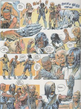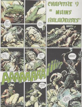 remarques: | récit divisé en 5 épisodes: 1) les mutants dans l'étang l'attaque des raks = des lézards-mutants et leurs démêlés avec les morenos = genre de murènes à pattes >> p. 5 le cri de guerre des raks: ric rac tout craque quand raks attaquent >> p. 10 la garde du tatar qui arrive bien ta-tard 2) Marie à la noce à la recherche de Toubi, l'homme-médecin qui peut arranger la main de Coderc, l'attaque des chevêcheurs = centaures dont le chef veut s'accoupler avec la jument Marie >> p. 17 l'accouplement de Marie avec Pampi, chef des chevêcheurs 3) le sable qui mange où l'on retrouve Télée et où Coderc reçoit une main artificelle de fer >> p. 19 la statue de De Gaulle taillée dans la falaise 4) corrida pour Joseph le taureau prisonnnier des cochons qui veulent le mettre à mort lors d'une corrida 5) mains baladeuses où Coderc trouve un allié sous la forme d'une main-plante verte vivante qui lui va comme un gant, prisonniers du monde de Perp (Perpignan) après avoir traversé le lac de verre >> p. 40 la mère-main qui pond des petites mains >> le graphisme est toujours bon, mais le scénario mi-fantastique mi comique est plutôt désordonné quoique assez amusant |