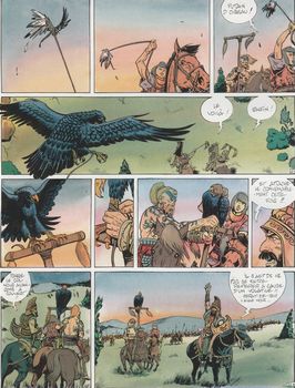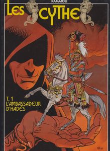 remarques: | Thrace orientale, une caravane est menacée par les Scythes qui ont envahi le pays >> p. 4 l'énomotarque = le chef de la caravane = le capitaine l'ambassadeur d'Hadès alias Aigle Noir = l'espion des Scythes qui voyage incognito dans la caravane déguisé en vieil aveugle accompagné d'un jeune homme >> p. 21 description des Scythes, des vrais barbares qui vivent dans l'attente de la mort la caravane arrive enfin à la ville fortifiée d'Aedirna, mais suite à l'intrusion des deux espions dans la cité de la reine d'Arda, les portes sont ouvertes et les scythes s'emparent de la ville sans combat, toutefois, au lieu de tout massacrer comme à l'accoutumé, ils épargnent les habitants >> p. 30 et 43 la métamorphose du vieil aveugle en un personnage jeune et bien musclé (il s'est même confectionné une dent en ivoire d'éléphant pour remplacer le trou dans la mâchoire du vieil aveugle) qui essaie maintenant de s'attirer les faveurs de la reine mais le roi scythe Madyes a une bonne raison pour épargner les gens d'Aedirna, contre des otages il veut un traité d'alliance avec la cité importante du roi d'Arda, afin de s'assurer le passage des cols thraces et la reine d'Arda lui sert de monnaie d'échange, Hadès est chargé de négocier avec le roi d'Arda >> un premier album peu convaincant ni pour le scénario (peu élaboré), ni pour le texte (plutôt vulgaire) ni pour le graphisme (peu étudié); contrairement à sa série principale Zoulou (Ramaïoli/Durand) qui est beaucoup plus étoffée et à une série dans le genre = Vae Victis (Mitton/Rocca, Rocca étant le pseudonyme de Ramaïoli), n.b. il ne paraîtra d'ailleurs que trois albums de cette série |