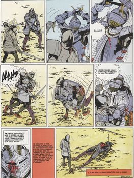 remarques: | album à cinq épisodes 1/ - la couleuvrine (1428) la mort du comte de Salisbury (Thomas Montaigu), un grand stratège, par une décharge de couleuvrine changera la destinée du siège d'Orléans (27.10.1428) 2/ la dernière charge (1431) celle de René le Bon, duc de Lorraine, futur roi de Naples, malgré l'avis contraire de son conseiller Guilhem de Barbazan (le chevalier sans reproche) dans la plaine de Bugnéville le 2.7.1431 et qui subit une défaite totale contre les troupes bourguignonnes de Philippe le Bon dirigées par le maréchal de Toulongeon, la chevalerie était bel et bien morte >> p. 14 la charge fatale 3/ l'écorcheur (1438) en Guyenne, des bandes de pillards appelés les écorcheurs ravagent un pays déjà ruiné par la guerre anglo-française, une bande était dirigée par Rodrigue de Villandrando, surnommé l'empereur des brigands ou l'écorcheur qui remporta une bataille gagnée sans combattre sur l'anglais, le comte de Huntingdon 4/ Henri le Fol (1474) Henri de Wurtemberg, comte de Montbéliard, est menacé sur ses terres par Charles le Téméraire et étant fait prisonnier par le maréchal de La Marche, Henri est menacé d'être exécuté si Montbéliard n'ouvre pas ses portes, les bourgeois de Montbéliard ne se laissent pas intimider et finalement Henri ne sera pas exécuté, mais il restera prisonnier durant 5 ans et perdra la raison durant son emprisonnement 5/ le duel (1502) guerre entre Louis XII et le roi d'Aragon pour le trône de Naples, don Alonso (un aragonais), prisonnier de Pierre du Terrail, seigneur de Bayard (un dauphinois) s'évade malgré la parole donnée de ne pas chercher à s'enfuir, il est rattrapé et cette fois enfermé sévèrement puis libéré contre rançon, il accuse du Terrail de l'avoir maltraité, il est alors défié par du Terrail dans un duel pour laver cet affront, malgré la fièvre qui le terrasse, du Terrail sort vainqueur du duel et par ce combat inégal gagné, il entre dans la légende comme le chevalier Bayard sans peur et sans reproche >> un album tout à fait intéressant de par surtout les épisodes historiques peu connus |