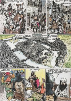remarques: | titre complet: les Templiers, le sang et la gloire six épisodes: 1/ la montagne maudite (1147-1148) le passage du mont Cadmus par les troupes du roi Louis VII lors de la deuxième croisade où les premiers templiers (les manteaux blancs) font preuve de grande bravoure 2/ la prise de Santarem (1147) au Portugal, l'escalade nocturne de la forteresse sarazine par les hommes de Sire Alfonso et du grand-maître Gualdimpais 3/ l'or du diable (1144-1154) l'alliance des Templiers de Gaza avec les égyptiens fidèles à la soeur du calife assassiné contre les égyptiens rénégats de Nast-Eddin 4/ la vraie croix (1182) défaite de Lusignan, mal conseillé par le grand-maître Rideford à Tibériade contre l'armée de Saladin et la sainte croix enterrée dans le désert avant la bataille pour la mettre à l'abri ne sera plus retrouvée par la suite 5/ la chute de St-Jean d'Acre (1291) mort du grand-maître, la trahison des sarasins et l'exécution du maréchal de la ville, fin de l'aventure templière en Terre Sainte 6/ la fin des Templiers (1314) la rétraction des Templiers et leur exécution par le feu avec le grand-maître Jacques de Molay par le roi Philippe le Bel, mais les Templiers auront quand même gagné leur dernière bataille en fin d'album: la règle des Templiers (dure, dure) >> un album assez intéressant sur les Templiers, mais sans grande prétention surtout du point de vue graphique |