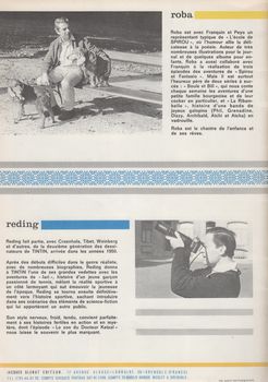 remarques: | cahier consacré pour la première partie à Jean Roba et pour la deuxième partie à Raymond Reding (>> CBD Roba voir sous Boule et Bill) deuxième partie: Raymond Reding 1/ préface de François Craenhals hommage à Reding, le dessinateur sportif, décontracté, au rire facile, plein de savoir-vivre et de savoir-faire 2/ entretiens avec Reding by Jacques Glénat Reding, le dessinateur populiste-sportif débute chez Bravo grâce à Jean Dratz, puis passe au Journal de Tintin en même temps que Craenhals en 1957 avec la biographie de Monsieur Vincent, le pacte de Pashutan et le "chinois" au manteau rouillé puis le sport devient la toile de fond de ses histoires, parfois mélangé de science-fiction avec le surhomme Olympio, particulièrement dans l'épisode du dr Ketzal semblable à Jacobs, il voulait aussi devenir chanteur d'opéra à noter que Reding est son propre scénariste/dessinateur 3/ Reding et la littérature populaire by François Rivière style roman rose (romance anglaise) et roman mystère (genre Edgar Poe) ainsi que populiste (Dickens, Malot) 4/ l'imagination de Reding by Numa Sadoul dissertation sur la BD sportive permettant une certaine virtuosité dans la peinture du corps humain, les oeuvres de Reding présentent une imagination fertile avec des récits de suspense, novateur du genre sportif avec Pellos (boxe et cyclisme) et tout comme Pellos dans "Futuropolis", Reding mêle sport et fantastique tel dans la section R avec des éléments surnaturels et de la science-fiction avec Olympio dans le zoo du dr Ketzal bien que Reding reconnaisse que dans ce récit le scénario montre un enchevêtrement d'actions sans réel fil conducteur à noter les séries sportives: - 1ère série Jari et le dr Jimmy Torrent sur fond de populisme social avec M. Bertault le richissime mécène (tennis, médecine, orphelinat, cécité) - 2ème série Vincent Larcher (football et divers sports) - 3ème série section R (natation) avec l'apparition d'Olympio, influence inconsciente des super héros US 5/ bibliographie - Monsieur Cro dans Bravo (1947) - les disques de feu en collaboration avec Bourlès dans le Journal de Tintin - Monsieur Vincent, pacte de Pashutan et chinois au manteau rouillé, puis ce seront les séries de sport - Jari 12 titres produits 1960-1979 - Vincent Larcher 6 titres produits 1969-1975 - section R 8 titres produits 1975-1982 - Eric Castel 15 titres produits (essentiellement sur le football) 1979-1992 - fondation King 1 volume paru (sur l'athlétisme) en 1977 - Pytha 1 volume paru avec les aventures comiques d'un chien 1987 - Chris Larzac, le Grand Chelem 1 volume paru (tennis) 1990 + de nombreuses histoires complètes parues dans le Journal de Tintin (plus de 40) publiées entre 1954-1957 dont en annexe (dossier 462R et 464F): - no 285 8.4.1954 Lasalle premier sabreur de France - no 332 3.3.1955 2000 kilos de rancune (chasse au rhinocéros) - no 346 9.6.1955 l'homme qui a vaincu la nuit (Louis Braille) - no 348 23.6.1955 et la sauterelle passait partout (Henry Ford) - no 354 4.8.1955 l'odyssée du Sunning (histoire de pirates) - no 359 8.9.1955 monsieur Bertillon (l'anthropométrie) - no 362 29.5.1955 miss Casse-Cou mène le jeu (une fille de milliardaire) - no 366 27.10.1955 Louis Bréguet (constructeur d'avions) - no 380 2.2.1956 ils ont inventé le cinéma (les frères Lumière) - no 403 12.7.1956 l'ange de la musique (Mozart) - no 409 23.8.1956 le bombardier noir (le boxeur Joe Louis Barrow) - no 411 6.9.1956 une vie de chien (Rintintin) - no 430 17.1.1957 si tous les gars du monde (le boys town du père Edward Flanagan) - no 466 juin 1957 Alexandre Dumas + divers pages du Journal Tintin sur Monsieur Vincent, Pacte de Pashutan, chinois au manteau rouillé, Jari et le champion, Jari dans la tourmente, Jari et le plan Z >> une étude particulièrement intéressante sur Raymond Reding |