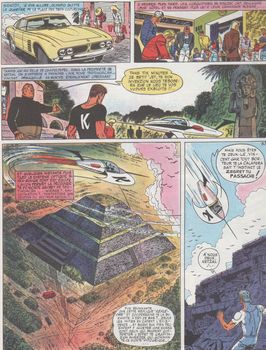 remarques: | édition Jeune Europe no 84, broché couleur, 46 pages n.b. seuls les deux derniers tomes "zoo du dr Ketzal" et "opération Penalty" sont collectionnés ici à titre d'exemplaires représentatifs de la série, les 4 premiers titres: - Olympic 2004 JE 62 1969 - 11 gauchers pour Mexico JE 67 1970 - le condottiere JE 69 1971 - mini-jupes et maxi-foot JE 78 1972 ne sont pas collectionnés ici les aventures de Vincent Larcher (footballeur), de Jimmy Torrent (entraîneur) et d'Olympio (le superman); aventures sportives sur fond de science-fiction fantastique le dr Ketzal, savant fou mexicain initié et héritier de Montezuma avec un accent germanique, membre de la secte des "hermanos" cherche à devenir le maître du monde en s'emparant des "cavaleras" portés par 4 autres initiés pour faire jaillir l'arme cosmique intégrale >> p. 6 la "cavalera" = bijou mystique aztèque en forme de tête de mort >> p. 12 le dr Ketzal une cavalera a été transposée à Vincent Larcher par l'entremise de l'un de ses collègues (un initié) pour protéger l'initié, Vincent devient maintenant la proie du dr Ketzal; pour délivrer Vincent de la malédiction, Olympio rejoint, via le continuum espace-temps, le monde du reflet de la pyramide de la lune (voyage dans le futur puis retour au présent) Olympio trouvera une alliée en la personne d'Erica, une assistante du dr Ketzal, mais ils devront affronter plusieurs mésaventures avant d'arriver à leurs fins >> p. 22 l'opération zoo >> p. 26 l'épreuve du jeu de Tlachtli les 3 tabernacles noirs = les trois autres cavaleras vaincu, le dr Ketzal quitte le reflet fatal en causant un souffle cosmique qui le désintègre >> un bon graphisme mais une histoire plutôt compliqué, quel enchevêtrement dans les actions sans fil conducteur, mais par contre une jolie illustration au premier plat |