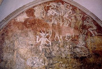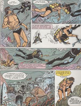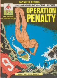 remarques: | édition Jeune Europe JE 101 46 pages, aventures sportives sur fond de polar Vincent Larcher, invité en Bretagne à participer dans un club local de football, est mêlé à une chasse au trésor sous-marine >> p. 4 Monsieur Bertault en mécène >> p. 7 en route vers la Bretagne avec le sauvetage un peu abracadabrant d'un car d'écoliers par Vincent Larcher Vincent devient l'hôte du prof. Drogoff et de sa fille Morgane qui leur explique qu'ils sont à la découverte de la ville antique de Ker Ankoun (en breton ker = village et ankoun = oubli), enfouie au fond de la mer, mais Morgane trahit son père avec Erwin, un étudiant allemand qui a appris que les nazis avaient caché durant la guerre un trésor au fond de la mer près de la cité antique péripéties sous-marines, kidnapping, chantage, etc finalement le trésor est découvert, mais il est bien protégé par une mine à retardement, Vincent et Morgane réussiront à y échapper, mais Erwin et son équipe périront dans l'aventure >> p. 34 un fort nageur, notre Vincent! >> p. 38 l'opération Penalty commencée grâce à la danse des morts de Kermaria >> p. 41 décidément, on utilise beaucoup les piqûres au sérum de vérité pentothal dans cet album >> un bon graphisme avec un scénario quelque peu banal mais acceptable n.b. la chapelle de Kermaria est, avec l'église de Kernascléden (Morbihan), le seul sanctuaire de Bretagne à posséder une fresque représentant ce thème de l'art macabre du Moyen Âge (danse des morts); cette fresque comportant 47 figures d'environ 1,3 m de haut, avait été recouverte de badigeon au XVIIIe siècle et remise au jour en 1856 par Charles de Taillart, la réalisation de cette fresque est située entre 1488 et 1501, soit environ un demi-siècle après celle du cloître des Innocents à Paris à Kermaria, la farandole macabre est située en hauteur, de part et d'autre de la nef principale, au-dessus des arcs séparant les bas-côtés de la nef, elle commençait par le personnage de l’Acteur (ou l’Auteur), aujourd'hui disparu, situé près du chœur côté épître, chargé de rédiger les sentences morales de huit vers chacune, tracées sous chaque personnage; après l’Acteur, la chaîne comprend, séparés par des squelettes au rire sardonique de nombreuses figures dont un astrologue, un pape, un empereur, un chartreux et un ménétrier, dans le bas-côté nord, face à la chapelle privative, une frise de 7 m de long à l'origine représentait, également a fresco, un Dit des trois morts et des trois vifs, dans des tons de grisaille sur fond ocre rouge |
