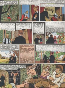 remarques: | titre complet: Monsieur Vincent, l'ami des pauvres, la vie de celui qui deviendra Saint-Vincent de Paul, édition Lombard/Desoer 1957, 4ème plat aux losanges avec comme dernier titre: le puit 32, album de 34 pages avec vignette à la dernière page >> biographie de Raymond Reding, >> voir série Pacte de Pashutan 1593 guerres de religion en France sous Henri IV et sa succession, à Toulouse, monsieur de Comet s'occupe de l'éducation du jeune Vincent de Paul, rencontre avec le mendiant professionnel Santiago >> p. 8 l'héritage de Vincent de Paul et la récupération de la dette >> p. 7 magnifique illustration d'un gratte-papier chez un notaire de l'époque au retour de son voyage à Marseille, Vincent est capturé par les pirates barbaresques mais il réussira à s'échapper avec son maître qu'il réussira à reconvertir au christianisme, par la suite, il devient le précepteur des enfants de monsieur de Gondi, général des galères du roi visite des prisons royales, lutte contre la peste, formation de dames nobles riches pour distribuer la charité >> p. 16 le jeu de la générosité Vincent de Paul est nommé par Louis XIII aumonier réal avec le grade d'officier de la marine du Levant >> p. 19 dans les cachots de Paris démêlés avec Mazarin durant la guerre de la Fronde Saint-Vincent de Paul sera le précurseur de l'abbé Pierre, fondateur des soeurs de St-Vincent de Paul = filles de la charité avec la première = Marguerite Naseau >> p. 34 la mort de Vincent de Paul, une des plus belles âmes que le ciel ait prêtée à la terre venait de s'envoler >> un volume de la célèbre collection Lombard, un graphisme de très bonne qualité avec un texte biographique assez intéressant et plutôt fidèle à la réalité |