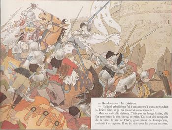remarques: | réédition de 1973, format à l'italienne édition pour la jeunesse 1/ préface par l'auteur 1422, mort de Charles VI qui lègue son royaume à Henri V, roi d'Angleterre suite à son mariage avec Catherine, fille de Charles VI et d'Isabeau de Bavière les anglais alliés avec la Bretagne et la Bourgogne tiennent la Guyenne, le nord (Normandie) et l'est de la France (Picardie) seul rempart vers le sud: Orléans sur la Loire, tenue encore par les troupes du Dauphin Charles VII qui réside à Bourges mais qui désespère, c'est alors qu'apparaît Jeanne d'Arc qui deviendra patronne, sainte et martyre de France 2/ Jeanne d'Arc naissance sous l'oeil de Dieu en 1412 à Domremy (Lorraine), à 13 ans apparition de l'archange Michel ainsi que de Sainte-Catherine et Sainte-Marguerite à 18 ans elle se rend chez Baudricourt pour lui demander de rencontrer le dauphin >> p. 11 rencontre avec le dauphin Charles >> p. 13 la bannière de Jeanne: Jesus Maria, les compagnons de Jeanne: le duc d'Alençon, le maréchal de Boussac, le sire de Rais, La Hire et de Xantrailles Jeanne pénètre dans Orléans, prise des bastilles St-Loup, Augustins et Tournelles, Orléans était délivrée puis victoires sur les anglais à Meung, Beaugency et surtout à Patay où Talbot est fait prisonnier >> p. 26/27 la charge française mais Jeanne ne voulut jamais se servir de son épée, son étendard était sa seule arme sacre de Charles VII à Reims, échec devant Paris, la cour du roi (dont La Trémoille) devient hostile à Jeanne Jeanne est faite prisonnière devant Compiègne en 1430 par Jean de Luxembourg, Charles VII n'ayant offert aucune rançon, Jean de Luxembourg la vend aux anglais n.b. il n'est pas vraiment établi si Charles VII a voulu payer rançon ou non, car il ne s'agissait pas uniquement d'une affaire financière mais aussi d'une affaire politique et Jean de Luxembourg a dû peut'être céder Jeanne d'Arc sous la pression des anglais et de l'évêque Paul Cauchon >> p. 44/45 Jeanne devant ses juges, elle fut condamnée comme hérétique, relapse, apostate et idolâtre elle meurt sur le bûcher le 30.5.1431 >> un album sans grande prétention par les éditeurs de Bécassine pour la jeunesse catholique de l'époque, mais avec un texte respectable et le graphisme a un certain charme n.b. le surnom de Jeanne la Pucelle d'Orléans n'est pas mentionné par l'auteur |