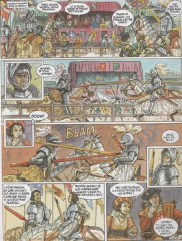 remarques: | titre complet: l'histoire de Bayard en BD pages de garde: début = chanson d'Yves Montand "j'avions reçu commandement" et en fin d'album "hymne à la gloire du chevalier Bayard" par Marcel Fakhoury août 1515 règne de François Ier, Bayard dirige une troupe à travers les Alpes par un chemin réputé impraticable pour surprendre l'armée piémontaise et ce sera la bataille de Marignan gagnée sur les Suisses grâce à l'artillerie française et grâce surtout à l'arrivée inopinée de renforts vénitiens qui mettent en déroute ces méchants suisses après la bataille, François Ier est adoubé (armé chevalier) roi-chevalier par Bayard et lors de la paix perpétuelle, Bayard rentre en son fief du Dauphiné avec son jeune ecuyer Thibault Bayard raconte sa vie à Thibault >> p. 11 âgé de 12 ans en 1486 au château de Pontcharra (Isère), Pierre Terrail de Bayard est envoyé comme page chez le duc de Savoie, puis en 1492 il est remarqué par le roi Charles VIII qui le prend à son service, il est surnommé "Picquet" >> p. 16 "ce qu'on dérobe à moine est pain béni" >> p. 17 premier tournoi de Bayard contre le fort sire de Vaudray, premières armes et faits de gloire en Italie, Bayard est fait chevalier par Charles VIII en 1521, la guerre reprend entre Charles Quint et Louis XII, le roi confie à Bayard la place forte de Mézières en Ardenne, dernier rempart contre l'armée espagnole et où Bayard use de ruse pour résister à l'ennemi >> p. 22 les trois règles de Bayard au combat: l'assaut, l'astuce et la grandeur d'âme l'épisode de Milan où capturé par Ludovic Sforza dit Le More, la hardiesse de Bayard lui vaut sa liberté >> p. 24/25 le duel contre l'espagnol herculéen Sotomajor suite à ses calomnies adressées à Bayard et durant lequel Bayard doit se battre à pied avec une forte fièvre, mais réussit par astuce et surprise à vaincre son adversaire et reçoit le titre de chevalier sans peur et sans reproche (Naples 1502) >> p. 26/27 l'épisode où Bayard défend seul le pont du Garigliano contre une troupe espagnole (1503) et les guerres d'Italie continuent contre sa sérénéssime de Venise, l'empereur Maximilien d'Autriche, Ferdinand d'Aragon et le pape Jules II Bayard est grièvement blessé lors de l'assaut sur la cité de Brescia et encore une fois à la bataille de Pavie (1512) >> p. 33 Bayard sans reproche mais pas sans quelque plaisir en 1513 il est fait prisonnier à Thérouanne par les troupes de Maximilien Ier d'autriche et de Henri VIII d'Angleterre, mais comme il s'est constitué prisonnier volontaire, il est relâché après Marignan, la peste s'abat sur Grenoble, capitale du Dauphiné gouvernée par Bayard, celui-ci demande l'aide de François Ier qui ignore ses doléances reprise de la guerre en Italie où Bayard trouve la mort à la bataille de Rovasenda (30.4.1524) >> p. 41 la mort de Bayard à la fin de l'album, documentation sur Bayard 1/ Bayard dans son siècle il servit trois rois: Charles VIII, Louis XII et François Ier, il grandit au rythme de la Renaissance, un grand mouvement rénovateur sur les plans littéraires, artistiques et scientifiques les écrivains les plus marquants: Montaigne, Rabelais et Ronsard les châteaux de la Renaissance: Amboise, Chenonceaux, Chambord et Fontainebleau la peinture avec Michel Ange, Raphaël, le Titien, Véronèse et Leonard de Vinci début des réformateurs: Luther, Calvin, Zwingli 2/ chronologie de 1475 à 1527 3/ principaux personnages du temps de Bayard: Anne de Bretagne, Louise de Savoie, Charles VIII, Louis XII, François Ier, Charles Ier duc de Savoie, Henri VIII, Charles-Quint, pape Jules II, Ludovic Sforza, Jacques II seigneur de la Palice (un quart d'heure avant sa mort, il donnait encore envie et non il était encore en vie), Gaston de Foix, Charles de Bourbon 4/ les amis de Bayard création en 1938 de l'association des amis de Bayard à Pontcharra qui ont lancé chez Glénat l'édition de cet album BD sur Bayard >> une biographie intéressante sur Bayard avec un texte bien élaboré, rédigé en partie en français ancien avec un graphisme original de Lacaf (dessinateur des "patriotes") |