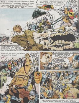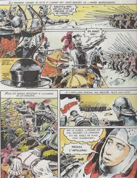 remarques: | dans la série: l'histoire suisse en bandes dessinées titre complet: de Conrad le Pacifique à la bataille de Morat Conrad le Pacifique, fils de Berthe assume la paix dans son royaume pour 50 ans, à sa mort en 993, son fils Rodolphe III lui succède, mais faible, il doit demander l'aide contre les nobles à son neveu, Henri II empereur du Saint-Empire germanique qui lui ravit le pouvoir >> p. 6 description des nobles qui se protègent en bâtissant des places fortes (donjons, châteaux) à la mort d'Henri II en 1024, Conrad II le Germanique, aussi neveu de Rodolphe, lui succède et se fait couronner roi de Bourgogne à Payerne, les évêques décrètent la trève de Dieu et l'Eglise prêche les croisades en 1191, fondation de Berne (de Baer = ours) par Berthold, duc de Zähringen, nommé recteur de Bourgogne, construction de cités libres fortifiées = Freiburg; à la mort de Berthold en 1218, trois partis se disputent le pouvoir: - Thomas de Savoie - les Kyburg - les Habsburg Pierre de Savoie, surnommé le petit Charlemagne, se débarrasse des Kyburg et règne sur la Suisse romande, la Savoie et le Piémont, il commence la construction du château de Chillon, à sa mort en 1265, Rodolphe de Habsburg, issu d'Argovie, prend le pouvoir et devient aussi empereur du St-Empire >> p. 14 Schwyz s'étant bien battu pour Rodolphe reçoit l'insigne de la croix sur sa bannière, Rodolphe accorde des droits (franchises) aux habitants de la Suisse centrale Rodolphe de Habsburg bat Ottokar de Bohème et devient ainsi empereur d'Habsburg-Autriche, Lucerne et Fribourg se soumettent, mais Berne résiste, finalement vaincus les bernois doivent aussi se soumettre à la mort de Rodolphe Ier en 1291, Albert Ier son fils lui succède, mais c'est Adolphe de Nassau qui est choisit comme empereur par les électeurs, lutte entre Adolphe et Albert, Adolphe est tué à la bataille de Göllheim en 1298 et c'est Albert qui devient finalement empereur, mais il est assassiné en 1308 par Jean de Souabe, son neveu, fils de Rodolphe II, pour une affaire d'héritage entretemps, Albert d'Habsburg voulait assujettir les trois vallées d'Uri, Schwyz et Unterwald = Nidwald et Obwald = vallis superioris (les Waldstätten) pour le contrôle du Gothard (le pont du diable) en leur imposant des baillis >> p. 17 les Waldstätten se révoltent en unifiant leurs forces au pacte du Grütli le 1.8.1291 sous l'impulsion de Werner Stauffacher, Arnold de Melchtal et Walter Fürst; pour un temps, Albert occupé ailleurs, les Waldstätten ne sont pas trop inquiétés n.b. la légende de Guillaume Tell par Schiller à la mort d'Albert, c'est Henri de Luxembourg qui est élu nouvel empereur de 1308 à 1312, il confirme les droits (franchises et droit d'immédiateté) des Suisses, mais meurt en 1313, à sa mort, Frédéric de Habsburg avec son frère Léopold disputent la couronne de l'empire à Louis IV Wittelsbach de Bavière, lutte entre Frédéric et Louis, le titre d'empereur reste vacant tandis que Frédéric confie à Léopold la régence de la Haute-Alsace et de la Suisse alémanique Léopold part en campagne pour punir les schwyzois qui ont pillé l'abbaye d'Einsiedeln, il est battu par une coalition des Waldstätten au Morgarten en 1315, à la mort de Léopold en 1326 à Strasbourg, Frédéric reprend le contrôle de tous les territoires des Habsburg (Autriche, Suisse alémanique, Carinthie = Tyrol du sud et Styrie = Slovénie) >> p. 12 le territoire des Habsburg et leur emblème: un aigle noir impérial >> p. 26/27 la bataille de Morgarten et le cor d'Uri - pacte de Brunnen en décembre 1318 (confirmation du pacte de Grütli) - Lucerne se soulève en 1332, Zurich avec Rodolphe Brun en 1351, Berne avec Rodolphe d'Erlach en 1339 (victoire à Laupen avec l'aide des Confédérés) >> p. 31 Glaris et Zoug en 1352 rejoignent aussi la Confédération - victoire des Suisses sur les Gugler (au casque pointu) = des mercenaires français commandés par Enguerrand VII de Coucy qui envahissent la Suisse en 1358 - nouvelle victoire sur Leopold III d'Habsburg qui est tué à la bataille de Sempach en 1386 >> l'acte héroïque d'Arnold Winkelried son frère Albert III d'Habsburg reprend les hostilités, mais il est à nouveau battu par les glaronnais commandés par Matthias Ambühl à Näfels en 1388 - paix de Zurich en 1393, les 8 cantons sont reconnus indépendants >> p. 37 en 1415 les Confédérés sont désignés officiellement par le nom collectif de "schwyzois" = suisses - 1415 Berne conquiert l'Argovie, guerre entre Schwyz et Zurich (mort de Rodolphe Stüssi) en 1440 pour l'héritage du Toggenburg, extermination de la garnison de Greifensee, les suisses mènent maintenant une guerre de conquête - Frédéric III de Habsburg demande l'aide du roi de France Charles VII qui, à la fin de la guerre de Cent Ans, lui envoie pour s'en débarrasser un fort parti d'Armagnacs (surnommés Ecorcheurs à cause de leur cruauté) menés par le dauphin Louis (1444), ceux-ci battent un corps expéditionnaire suisse de 1500 hommes à la bataille de Saint-Jacques-sur-la-Birse, mais subissent d'énormes pertes (10'000 hommes), le dauphin Louis ayant été fortement impressionné par les suisses conclut la paix à Ensisheim le 28.10.1444, une bonne et perpétuelle amitié avec la France; pour les suisses cette défaite sera en quelque sorte une victoire >> p. 40 "les dompteurs de rois" = nom donné aux Confédérés à cette époque - en 1460 les Confédérés enlèvent la Thurgovie aux Habsburg, les suisses envahissent aussi le pays de Vaud = possession de la Savoie, alliée du duc Charles de Bourgogne et suite à une offensive des suisses sur Héricourt et Montbéliard, Charles le Téméraire lève une puissante armée (qu'on croit invincible) et part en guerre contre les Confédérés, Louis XI soutient indirectement les suisses en leur offrant de l'or - février 1476 bataille de Grandson >> p. 44 l'appel du taureau d'Uri et de la vache d'Unter